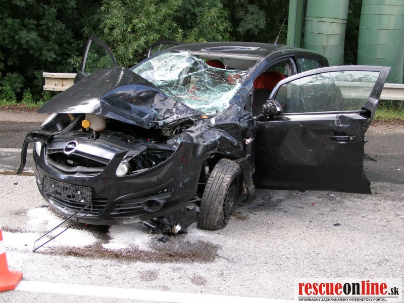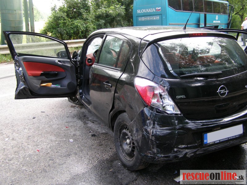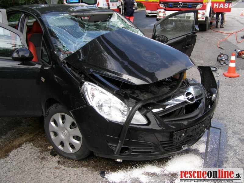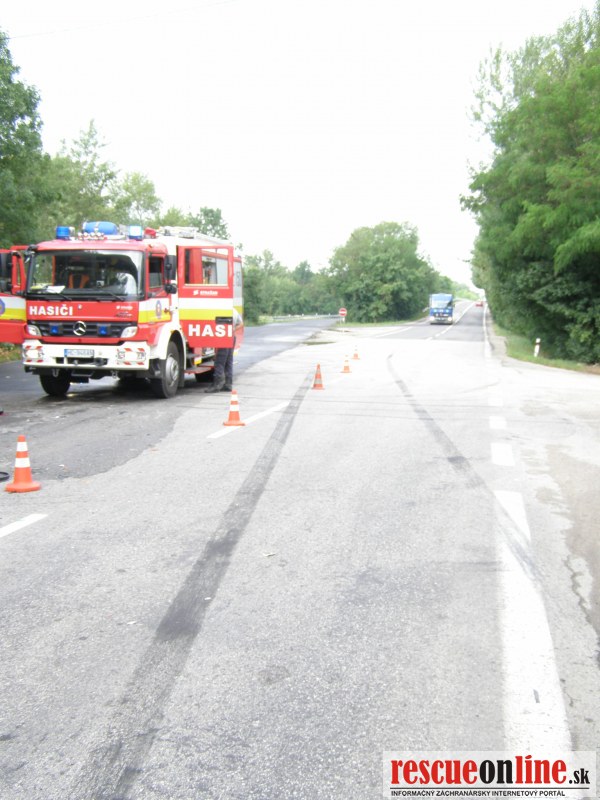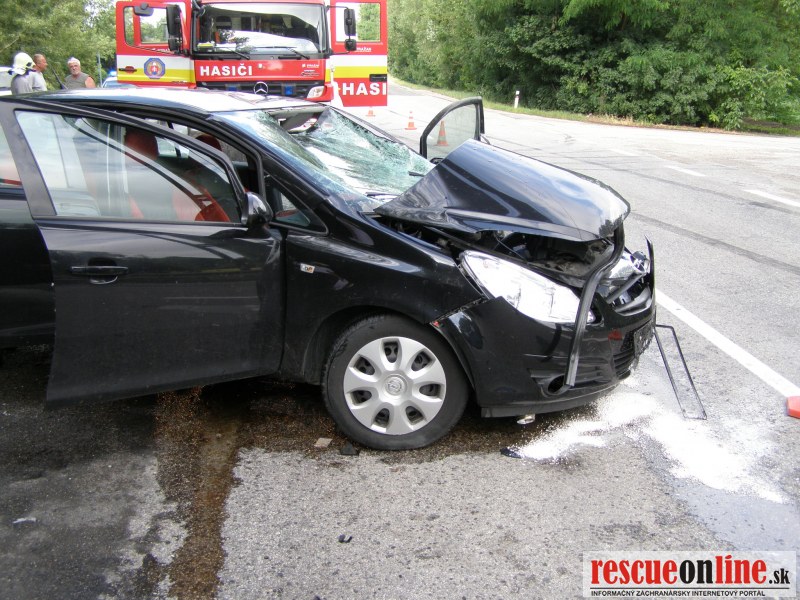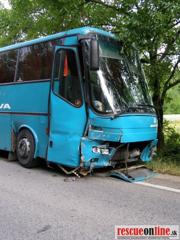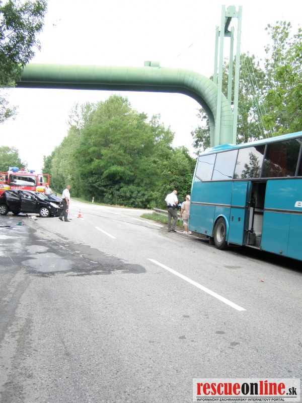KR HaZZ Trnava |MM| Na operačné stredisko bola vo štvrtok dňa 21.6.2012 o 07,59 h bola ohlásená dopravná nehoda osobného motorového vozidla a zájazdového autobusu na št. ceste č. I/61 v katastri obce Červeník, okres Hlohovec. Na miesto udalosti boli z hasičskej stanice Hlohovec vyslaní štyria príslušníci HaZZ s hasičskou technikou AHZS MB Atego. V dôsledku dopravnej nehody došlo k zraneniu jednej osoby (v osobnom motorovom vozidle). Zasahujúci príslušníci Okresného riaditeľstva Hasičského a záchranného zboru v Piešťanoch (z hasičskej stanice v Hlohovci) vyslobodili zranenú osoby z havarovaného vozidla pomocou hydraulického vyslobodzovacieho zariadenia, poskytli zranenej osobe predlekársku prvú pomoc a pomohli ju naložiť do vozidla Zdravotnej záchrannej služby. Havarovaný automobil zabezpečili proti vzniku požiaru, vytečené prevádzkové kvapaliny posypali sorbentom (Vapex). V autobuse boli deti, všetky bez zranenia.