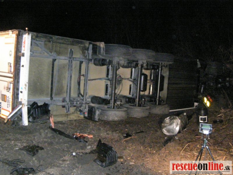 KR HaZZ Trnava |MM| Na ohlasovňu požiarov hasičskej stanice v Hlohovci bola dňa 7.3.2013 o 23:31 hod. prostredníctvom Koordinačného strediska IZS v Trnave nahlásená dopravná nehoda dvoch kamiónov na 75. kilometri diaľnice D1 pri Hlohovci v smere do Piešťan s neuvedeným počtom zranených osôb. Na miesto udalosti boli vyslaní štyria príslušníci z hasičskej stanice v Hlohovci s technikou MB ATEGO. Po príchode hasičskej jednotky na miesto udalosti bolo prieskumom zistené, že sa jedná o dopravnú nehodu slovenského kamiónu značky VOLVO, prevážajúceho mliečne výrobky a nákladného vozidla značky IVECO EUROCARGO s poľským evidenčným číslom, prevážajúceho prepravky, pričom havarovaný kamión sa nachádzal na boku mimo vozovky a nákladné vozidlo na kolesách tiež mimo vozovky, pričom náklad z neho bol porozhadzovaný na komunikácii. V čase príchodu hasičskej jednotky sa účastníci nehody nachádzali mimo vozidiel bez zranení, na mieste udalosti sa nachádzali príslušníci PZ SR. Po krátkom čase sa však vodič kamióna začal sťažovať na bolesti chrbtice, z tohto dôvodu mu bola poskytnutá predlekárska prvá pomoc a po príjazde vozidla Zdravotnej záchrannej služby bola zranená osoba odovzdaná do starostlivosti službukonajúceho lekára. Následne zasahujúci hasiči zistili, že na havarovanom kamióne je odtrhnutá a prerazená nádrž na PHM o objeme 1.000 litrov, z ktorej unikala nafta. Z tohto dôvodu bola na miesto udalosti povolaná hasičská jednotka z Trnavy s ekologickým vozidlom IVECO DAILY a bola vyrozumená aj Slovenská inšpekcia životného prostredia – odbor inšpekcie ochrany vôd. Hasiči z Hlohovca na havarovanom vozidle vykonali protipožiarne opatrenia, pričom počas celého zásahu osvetľovali miesto udalosti osvetľovacím agregátom. Po príchode hasičov z Trnavy bola nádrž na PHM zabezpečená proti ďalšiemu úniku a zvyšná časť nafty v objeme cca. 120 litrov bola následne pomocou špeciálneho čerpadla prečerpaná do pripravených nádob a s vedomím majiteľa spoločnosti, vlastniacej havarovaný kamión prevezená na hasičskú stanicu do Trnavy. Miesta úniku nafty boli posypané sorpčnými látkami a komunikácia očistená. Po zdokumentovaní udalosti a zbalení vecných prostriedkov sa prítomné hasičské jednotky vrátila späť na svoje základne.