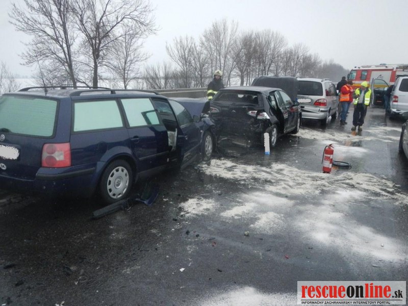 KR HaZZ Trnava |MM| Na ohlasovňu požiarov hasičskej stanice v Trnave bola dňa 29.3.2013 o 11:17 hod. prostredníctvom Koordinačného strediska IZS v Trnave nahlásená dopravná nehoda na diaľnici D1 v smere z Bratislavy do Trnavy pred odpočívadlom Zeleneč s bližšie nešpecifikovaným počtom vozidiel a zranených osôb. Na miesto udalosti boli vyslaní 7 príslušníci z hasičskej stanice v Trnave s technikou MB VARIO a MB SPRINTER. Počas jazdy k miestu ohlásenej udalosti hasičská jednotka postupovala vzhľadom k tvoriacim sa kolónam pomaly, pričom narazili na viacero nehôd. Piati príslušníci s technikou MB VARIO zostali na mieste prvej dopravnej nehody na 45,5 km diaľnice D1, kde sa zrazili tri osobné motorové vozidlá, následkom čoho sa ľahko zranili dve osoby, z toho jedno dieťa – zraneným osobám poskytli zasahujúci hasiči predlekársku prvú pomoc. Po príchode prvého vozidla Zdravotnej záchrannej služby bola jedna zranená osoba odovzdaná do starostlivosti službukonajúceho lekára. Príslušníci HaZZ následne zabezpečili havarované vozidlá proti úniku prevádzkových kvapalín a vytečený olej posypali sorpčnými látkami. Po príchode druhého vozidla ZZS a príslušníkov PZ SR hasičská jednotka s technikou MB VARIO pokračovala v smere do Trnavy k ďalšej nehode. Dvaja príslušníci s technikou MB SPRINTER sa medzitým presunuli k ďalšej dopravnej nehode – zrážke štyroch osobných motorových vozidiel s dvomi zranenými deťmi. Hasiči poskytli zraneným osobám predlekársku prvú pomoc, po postupnom príchode vozidiel ZZS odovzdali obe zranené deti do ich starostlivosti a na havarovaných vozidlách vykonali protipožiarne opatrenia. Po príchode príslušníkov PZ SR a zamestnancov Národnej diaľničnej spoločnosti príslušníci HaZZ zdokumentovali jednotlivé udalosti a po zbalení vecných prostriedkov sa vrátili na svoju základňu. K udalostiam pri Zelenči bola medzitým vyslaná aj hasičská jednotka zo Senca s tromi príslušníkmi a technikou MB ATEGO. Počas cesty na miesta dopravných nehôd jednotka spozorovala cca. 1 km pred odbočkou na Voderady ďalšiu dopravnú nehodu až 7 osobných motorových vozidiel. Keďže sily a prostriedky pri Zelenči postačovali na zvládnutie odstraňovania následkov nehôd, hasiči zo Senca zostali zasahovať na uvedenom mieste, kde vplyvom zrážky uvedeného počtu vozidiel boli ľahko zranené dve osoby. Do príchodu zdravotných záchranárov hasiči zabezpečili havarované vozidlá proti vzniku požiaru a rozliate prevádzkové kvapaliny posypali sorpčnými látkami. Po odovzdaní zranených osôb službukonajúcim lekárom, zdokumentovaní udalosti a zbalení vecných prostriedkov sa jednotka vrátila na svoju základňu. Počas vykonávania zásahu oboch hasičských jednotiek bola diaľnica D1 v smere zo Senca do Trnavy uzatvorená. Celková bilancia dopravných nehôd medzi 42. a 46. kilometrom diaľnice D1 v smere zo Senca do Trnavy: 14 havarovaných vozidiel, 35 účastníkov dopravných nehôd, 6 ľahko zranených osôb, z toho tri deti.