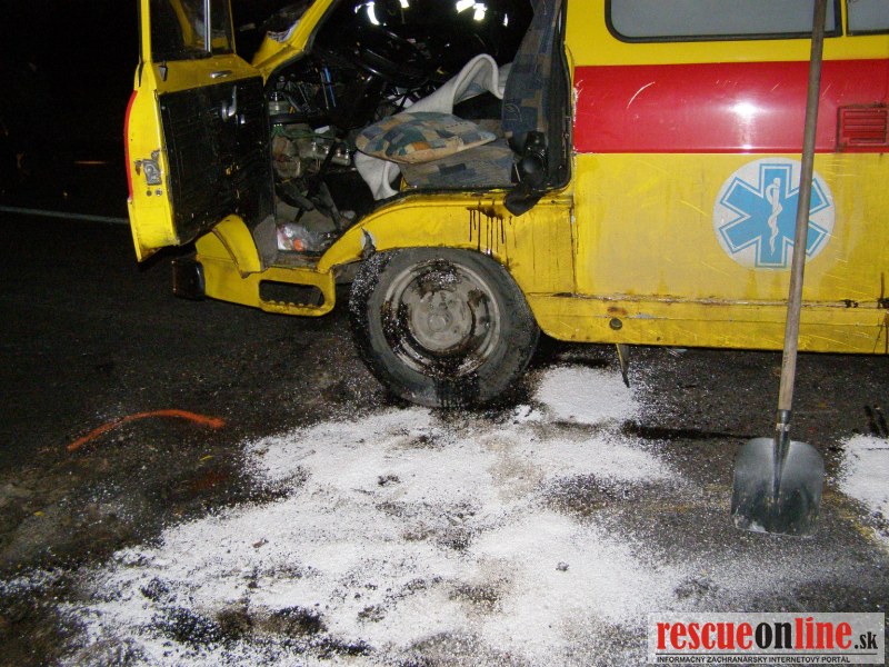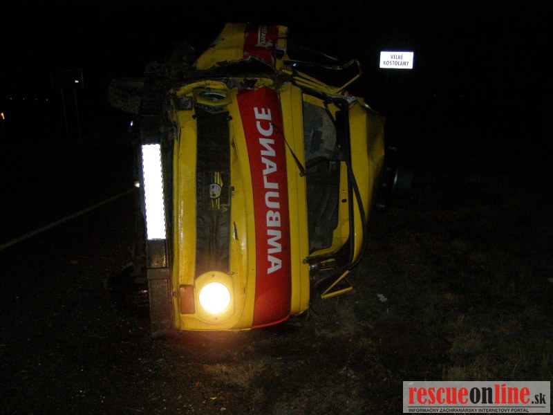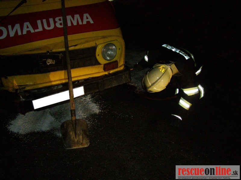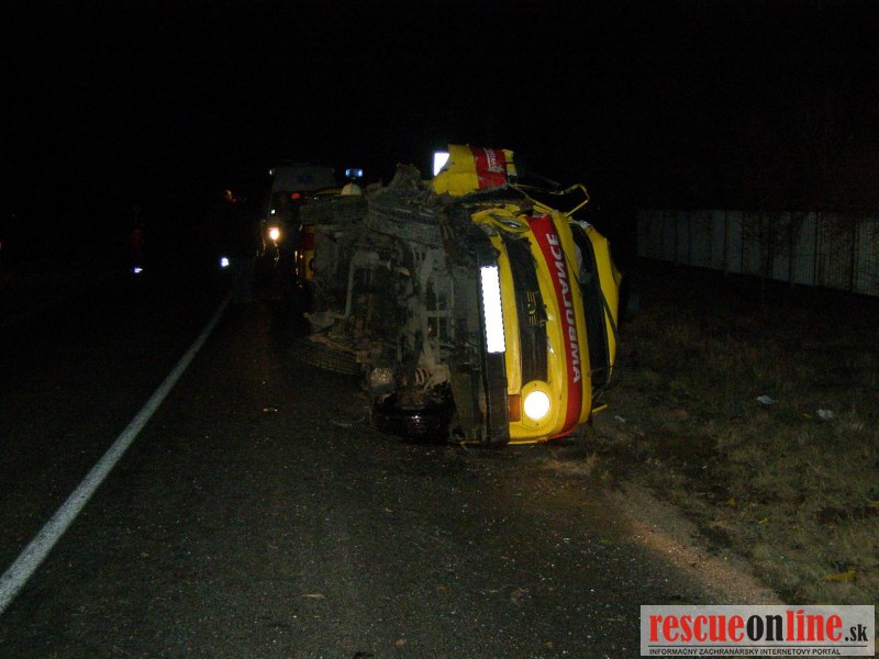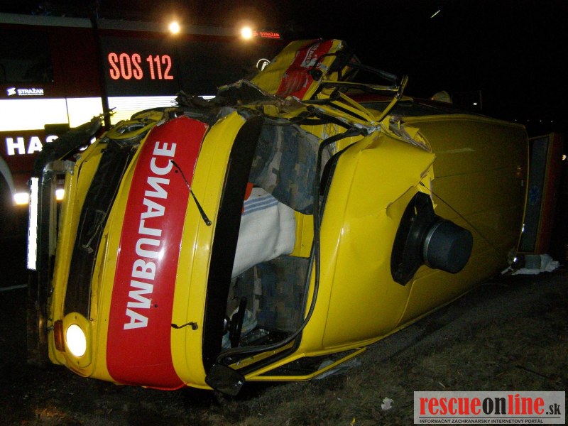 KR HaZZ Trnava |MM| Na ohlasovňu požiarov hasičskej stanice v Piešťanoch bola KS IZS v piatok 2. marca 2012 o 01:03 hod. nahlásená dopravná nehoda prevráteného sanitného vozidla za obcou V. Kostoľany smerom na obec Nižnú. Na miesto ohlásenia bola vyslaná jednotka HaZZ, štyria príslušníci s technikou MB Atego. Po príjazde na miesto udalosti bolo prieskumom zistené, že sanitné vozidlo Š 1203 sa nachádza prevrátené na ceste. Vodič sanitky sa nachádzal mimo vozidla bez zranenia, avšak v zadnej časti havarovanej sanitky sa nachádzal zranený pacient, ktorého sanitka prevážala. Na mieste nehody bola prítomná polícia Vrbové a posádka ZZS, ktorá zraneného pacienta a vodiča sanitky odviezla na ďalšie vyšetrenie do nemocnice. Jednotka HaZZ vykonala na vozidle protipožiarne opatrenia, prevrátila vozidlo na kolesá a zlikvidovala za pomoci sorbentu vytečené prevádzkové kvapaliny. Po zdokumentovaní nehody jednotka HaZZ zásah ukončila a o 03:29 hod. vrátila na základňu.