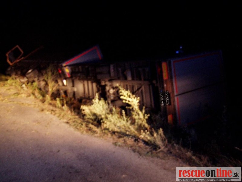 KR HaZZ Trnava |MM| Na ohlasovňu požiarov hasičskej stanice vo Veľkom Mederi bola dňa 10. júla 2012 o 22:31 hod. prostredníctvom Koordinačného strediska IZS v Trnave nahlásená dopravná nehoda kamióna v blízkosti obce Okoč (okres Dunajská Streda). Na zatiaľ bližšie nešpecifikované miesto udalosti boli vyslaní traja príslušníci z hasičskej stanice vo Veľkom Mederi s technikou MB VARIO, ktorí podľa dovtedy dostupných informácií začali prehľadávať cestu medzi obcami Okoč a Brestovec, pričom na základe ďalších informácií bolo spresnené miesto udalosti, a síce medzi obcou Okoč a osadou Nový Golyáš. Po príchode na miesto udalosti bolo prieskumom zistené, že sa jedná o dopravnú nehodu kamióna, ktorý bol prevrátený na boku v priekope. Pri tejto dopravnej nehode neprišlo k zraneniu žiadnej osoby a z havarovaného kamióna nevytekali žiadne prevádzkové kvapaliny. Príslušníci HaZZ vykonali na vozidle protipožiarne opatrenia, vytýčili miesto nehody dopravnými kužeľmi a počkali na príchod dopravnej polície a majiteľa kamióna, ktorému bolo následne miesto udalosti odovzdané. Hasičská jednotka sa po zdokumentovaní udalosti a zbalení vecných prostriedkov vrátila na základňu.