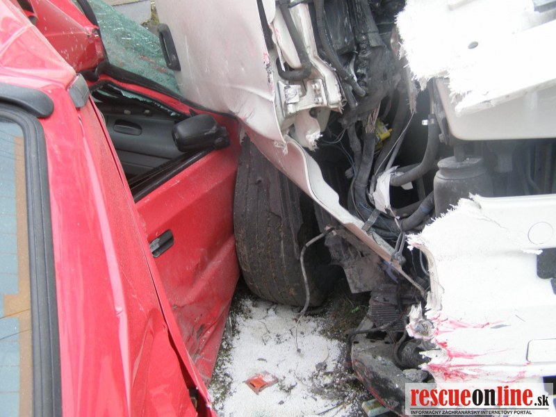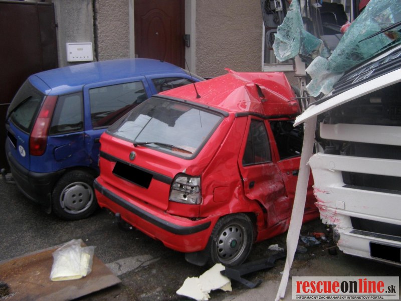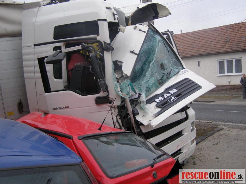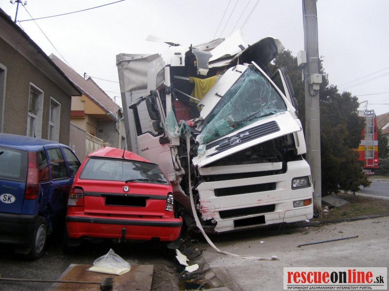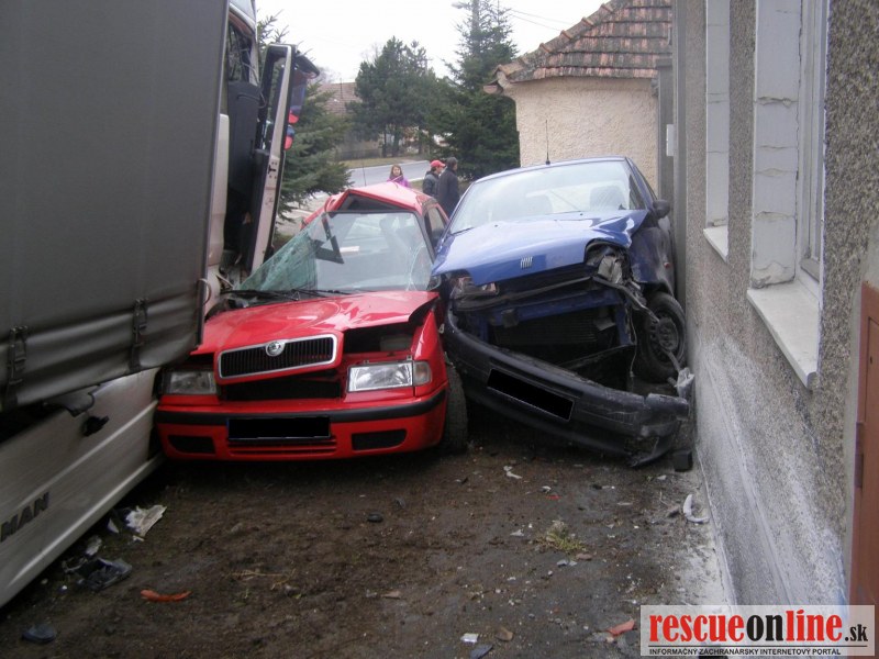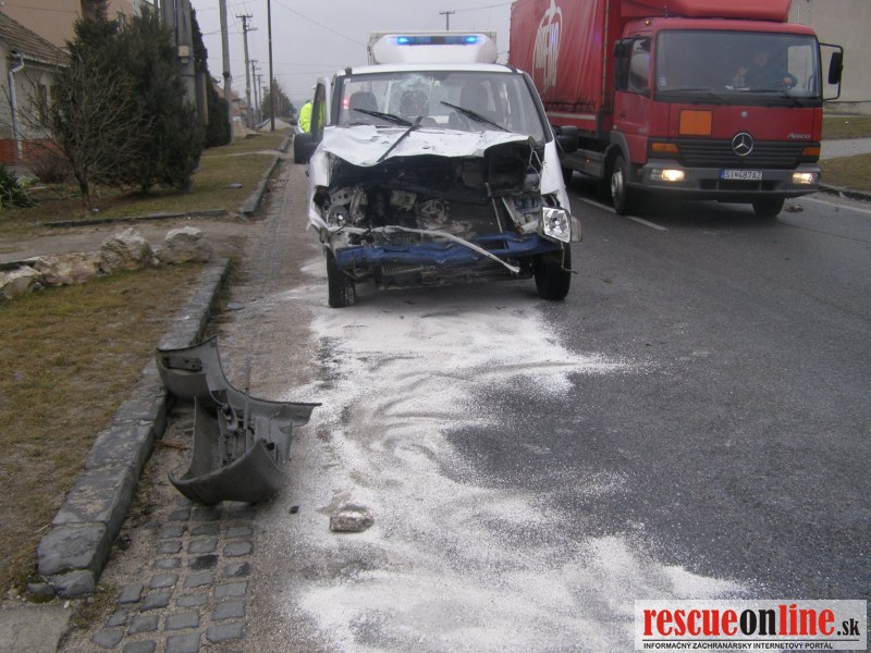 KR HaZZ Trnava |MM| Na OR HaZZ v Trnave bola v utorok 13. marca 2012 o 07:25 hod. nahlásená v obci Bíňovce, okr. Trnava, dopravná nehoda nákladného motorového vozidla a troch osobných motorových vozidiel. Na miesto udalosti bola vyslaná jednotka HaZZ, štyria príslušníci s technikou MB Atego. Po príjazde na miesto udalosti bolo zistené, že po dopravnej nehode sa nákladné vozidlo Man D26 nachádzalo narazené do dvoch stojacich osobných vozidiel Škoda Felícia a Fiat Punto bez pasažierov a účastným dopravnej nehody sa stalo aj dodávkové vozidlo MB Vito, v ktorom boli traja dospelí a jedno dieťa, všetci zranení. Okrem toho bol zranený aj vodič kamiónu. Veliteľ zásahu si vyžiadal na miesto udalosti vozidlo MB Sprinter a technické prostriedky na prečerpanie nafty z poškodenej nádrže ťahača, v množstve približne 200 litrov. Do príchodu Zdravotnej záchrannej služby príslušníci HaZZ poskytovali zraneným osobám prvú predlekársku pomoc. Následne zabezpečili vozidlá proti vzniku požiaru a proti ďalšiemu úniku prevádzkových kvapalín. Uniknuté prevádzkové kvapaliny boli zasypané sorbentom Vapex v množstve 30kg. Príslušníci HaZZ odstránili z vozovky za pomoci cestárov, ktorí sa taktiež dostavili na miesto udalosti, úlomky z poškodených vozidiel. Pretože pri dopravnej nehode bol poškodený stĺp elektrického vedenia, veliteľ zásahu si vyžiadal poruchovú službu. Zranené osoby boli po príjazde ZZS ošetrené a odvezené na ďalšie ošetrenie. Po ukončení zásahu sa jednotka o 09:23 hod. vrátila na základňu.