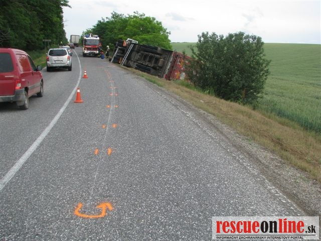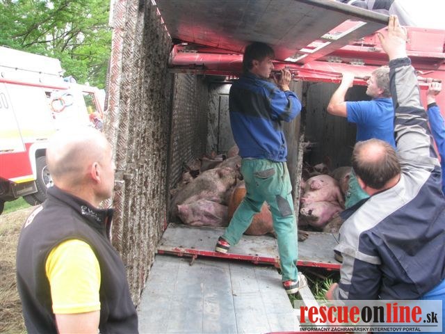 KRPZ Nitra |MM| Včera 12.6. asi o 14,45 došlo v levickom okrese medzi obcami Demandice a Šahy, v katastri obce Dolné Semerovce, ku dopravnej nehode nákladného vozidla Renault Premium naloženého živými prascami. 53 ročný vodič pravdepodobne v dôsledku neprispôsobenia rýchlosti jazdy svojím schopnostiam nezvládol riadenie v ostrej ľavotočivej zákrute a zišiel z cesty na pravú krajnicu, kde sa s vozidlom prevrátil. Pri nehode uhynulo stodva z dvesto prevážaných zvierat.
