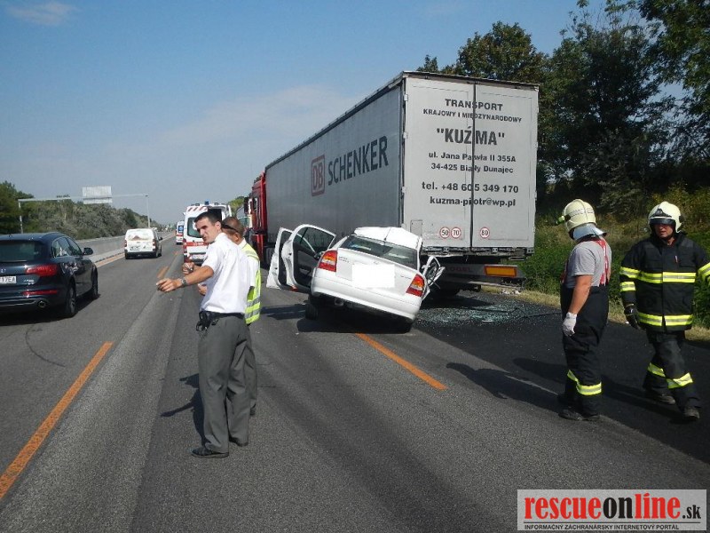 KRPZ Trnava | Pri včerajšej (22.8.) dopravnej nehode na diaľnici zahynula 55 ročná spolujazdkyňa. K dopravnej nehode došlo o 15.00 hod. na 46.km diaľnice D1 v smere od Bratislavy na Trnavu. Autobus idúci po diaľnici dostal defekt na ľavom prednom kolese, v dôsledku čoho zastavil v pravom jazdnom pruhu. Za autobusom sa pohyboval poľský kamión, ktorý ho pre hustú premávku nemohol obísť, preto zastavil za ním. Asi po dvoch minútach státia narazilo do ľavej zadnej časti kamiónu osobné auto Opel Astra. 55 ročná spolujazdkyňa z Hlohovca, časť Šulekovo, sediaca na prednom sedadle, utrpela zranenia, ktorým na mieste podľahla. 29 ročný vodič z tej istej obce a jeho 30 ročný spolujazdec z Vlčkoviec utrpeli ľahké zranenia a boli prevezení do nemocnice. Polícia alkohol u vodičov nezistila. Premávka na diaľnici bola obmedzená do jedného jazdného pruhu. Polícia začala trestné stíhanie pre usmrtenie.