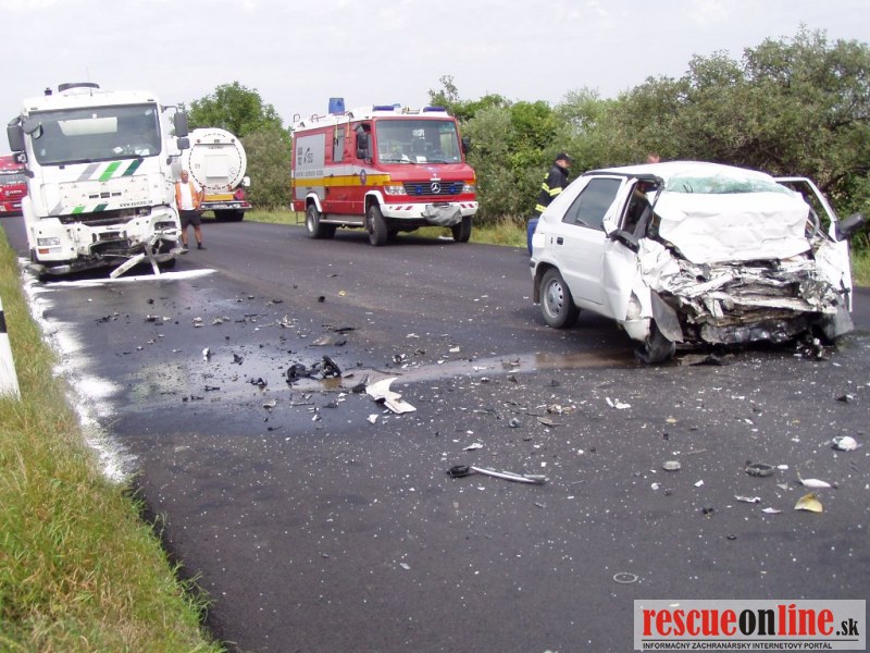 KR HaZZ Trnava |MM| Na operačné stredisko KR HaZZ v Trnave bola 21.8.2012 o 11:16 hod. oznámená dopravná nehoda nákladného vozidla s osobným motorovým vozidlom. Na miesto udalosti bola vyslaná z hasičskej stanice v Holíči technika AHZS MB Atego a AHZS MB Vario so 4 príslušníkmi. Po príjazde na miesto udalosti bolo zistené, že v osobnom motorovom vozidle sa nachádzajú dve osoby, ktoré nejavia známky života a lekár u nich skonštatoval smrť. Hasičská jednotka zabezpečila miesto udalosti proti vzniku požiaru a neutralizovala vytečené prevádzkové kvapaliny sorbentom. V týchto chvíľach hasiči začínajú s vyslobodzovaním tiel z havarovaného vozidla.