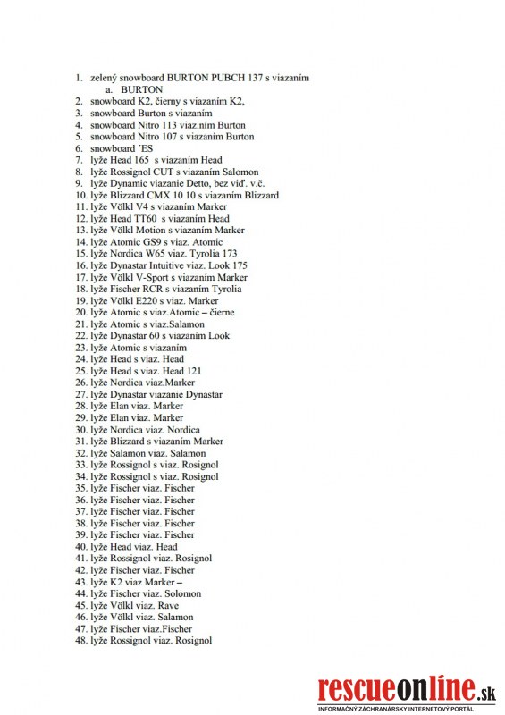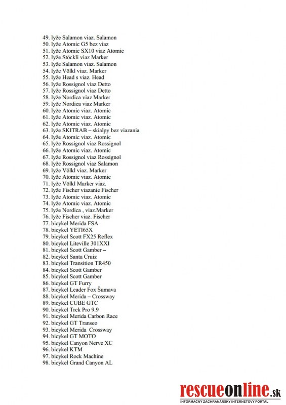 Polícia teraz zisťuje majiteľov zaistených športových vecí z nasledovného zoznamu (v prílohe). Touto cestou polícia vyzýva občanov, ktorým boli odcudzené veci uvedené v nasledovnom zozname, aby sa prihlásili na Odbore kriminálnej polície, 2. oddelení všeobecnej kriminality v Žiline v pracovných dňoch od 07.30 do 15.30 hod., alebo na t. č. 0961403625.
