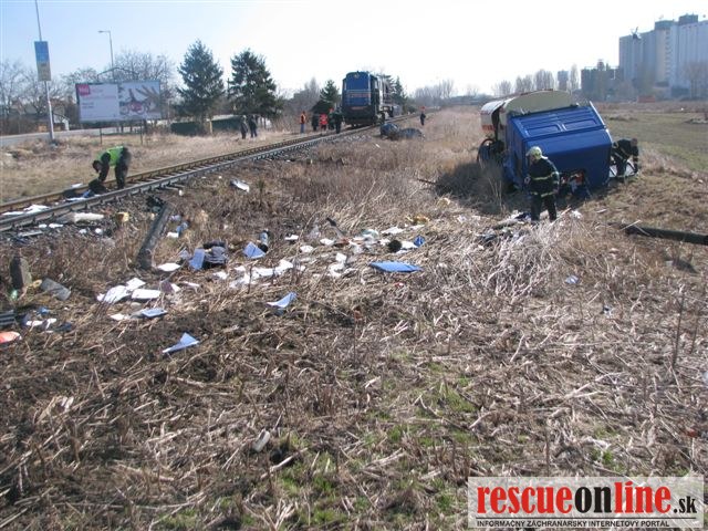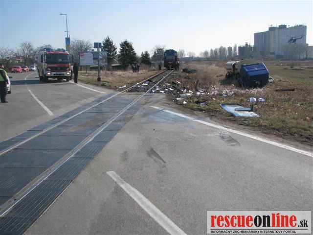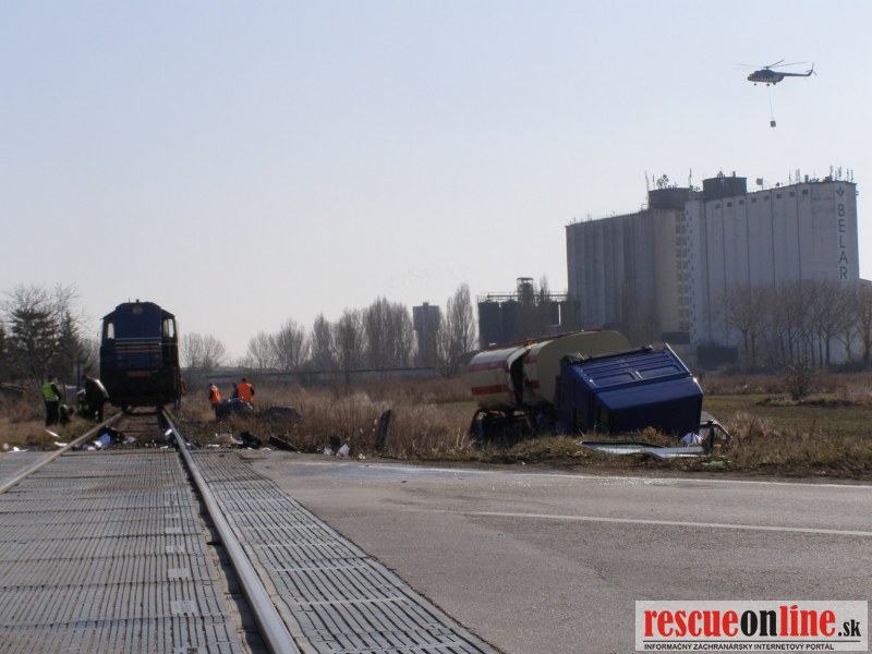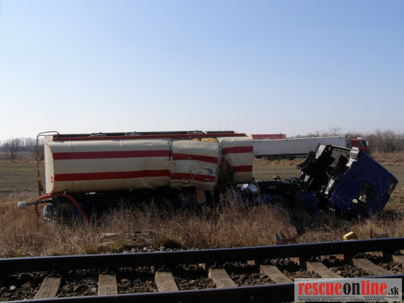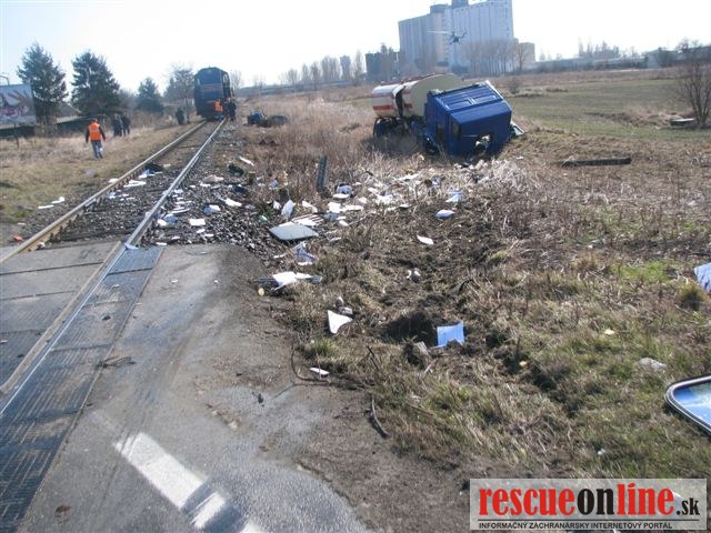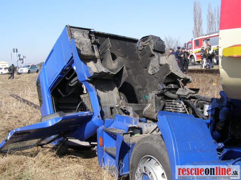 KR PZ Trnava | Dnes (6.3.) krátko pred jedenástou hodinou dopoludnia došlo k dopravnej nehode na železničnom priecestí v Dunajskej Strede. Vodič nákladného auta s cisternou sa pohyboval v smere od Záhradnej ulice na Bratislavskú cez železničné priecestie. Pravdepodobne si nevšimol svetelné a zvukové výstražné znamenie a vošiel do jazdnej dráhy nákladnému rušňu. Pri nehode bolo auto vymrštené mimo cestu, pričom sa prevrátilo cez strechu a dopadlo na kolesá. 54 ročný vodič nákladného auta z obce Rohovce utrpel zranenia ľahšieho charakteru, pričom zostal v nemocnici na pozorovanie. Dopravná nehoda sa zaobišla bez alkoholu u oboch vodičov. Polícia zisťuje výšku spôsobenej škody.