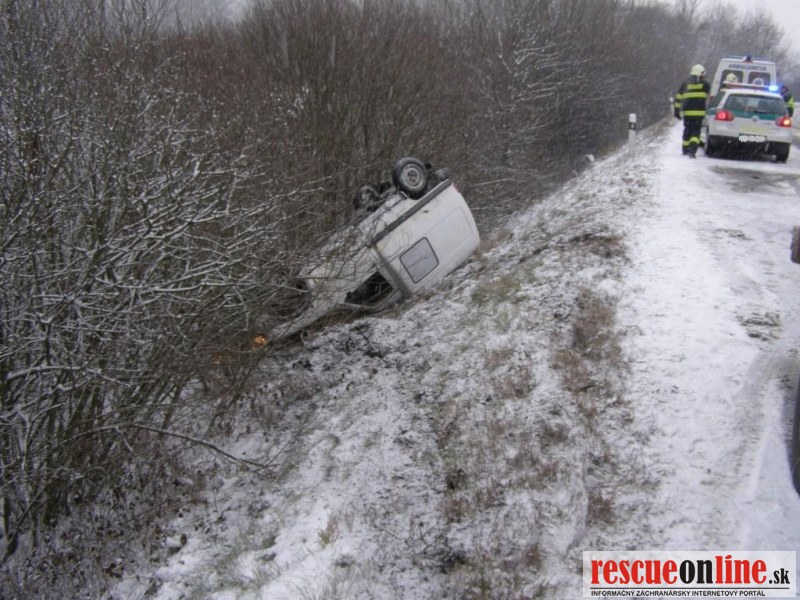 stručný popis udalosti: dopravná nehoda malého nákladného vozidla značky Citroen Jumper (prevráteného v priekope na ľavom boku) s jednou zranenou osobou (spolujazdec), bez úniku prevádzkových kvapalín