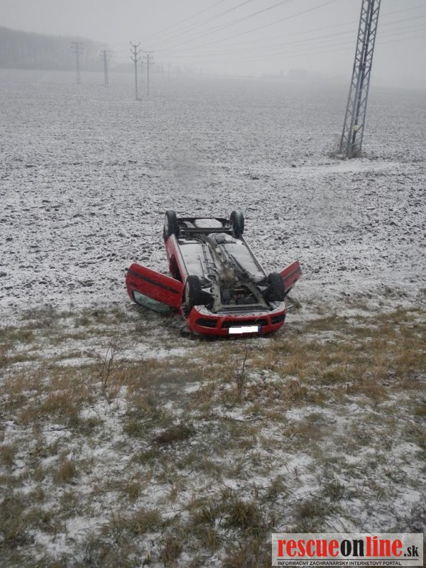 stručný popis udalosti: dopravná nehoda osobného motorového vozidla značky Škoda Fabia (prevráteného na streche v poli mimo komunikácie) s dvomi ľahšie zranenými osobami, bez úniku prevádzkových kvapalín