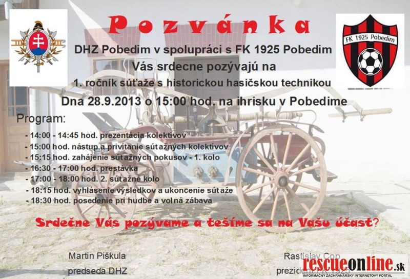 1. ročník súťaže s historickou hasičskou technikou sa uskutoční v Pobedime