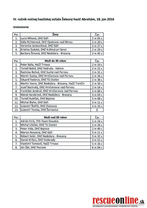 DHZ Abrahám |MM| V sobotu 18. júna sa na ihrisku v Abraháme uskutočnil v poradí už 4. ročník nočnej súťaže Železný hasič. Do súťaže jednotlivcov, ktorá simuluje zásahovú činnosť hasiča s použitím dýchacieho prístroja ako záťaže, sa celkovo prihlásilo 26 pretekárov z dobrovoľných aj profesionálnych zborov. Na trávnatom povrchu čakalo pre súťažiacich 7 náročných disciplín v troch kategóriách - ženy, muži do 30 rokov a muži nad 30 rokov. Hasiči mali na trati dlhej 200m za úlohu roztiahnuť hadice, vyliezť na 3m vysokú plošinu a vytiahnuť hadice, vykonať predpísaný počet úderov kladivom v hammer boxe, preskočiť 2m vysokú bariéru (ženy len 1m), ťahať 80kg figurínu na vzdialenosť 10m (ženy závažie s pieskom), prekonať 5m tunel so závažím a na záver trikrát prevrátiť pneumatiku. Podujatie sme zahájili o 21.30 hod. za účasti starostu obce Ing. Igora Németha a mjr. Mgr. Zoltána Takácsa, riaditeľa OR HaZZ v Trnave. Po úvodných príhovoroch boli súťažiaci poučený o pravidlách a bezpečnosti, potom nasledovalo plnenie disciplín v kategórii ženy. Súťažilo sa do neskorých nočných hodín, krátko po polnoci nasledovalo vyhodnotenie súťaže, vyhlásenie výsledkov a odovzdanie cien. V kategórii ženy sa na treťom mieste umiestnila Veronika Jankovičová z DHZ Gáň s časom 2 minúty 27 sekúnd. Na druhom mieste skončila Dáša Richterová z DHZ Opatovce nad Nitrou s časom 2 minúty 20 sekúnd. Prvé miesto získala po roku opäť Lucia Míková z DHZ Gáň s časom 2 minúty 5 sekúnd. V kategórii muži do 30 rokov sa na treťom mieste umiestnil minuloročný víťaz kategórie Rastislav Bohuš z DHZ Suchá nad Parnou s časom 2 minúty 32 sekúnd. Na druhom mieste skončil Tomáš Bobiš z DHZ Hodruša - Hámre s časom 2 minúty 22 sekúnd a na prvom mieste s najlepším časom 2 minúty 19 sekúnd sa umiestnil víťaz Peter Baša z HaZZ v Trnave. V kategórii muži nad 30 rokov na treťom mieste s časom 2 minúty 49 sekúnd skončil Peter Vida z DHZ Bojnice. Na druhom mieste sa s časom 2 minúty 34 sekúnd umiestnil Michal Libiček z DHZ TU Zvolen. Víťazom kategórie s časom 2 minúty 24 sekúnd sa stal Adrián Ficík z TFA Teamu Slovakia. Po súťaži nasledovala zábava až do skorých ranných hodín. Chceli by sme sa poďakovať hasičom za účasť a predvedené výkony, ukázali že dokážu prekonať nielen disciplíny ale aj samých seba. Takisto našim sponzorom, bez ktorých by sa nám nepodarilo zorganizovať takúto kvalitnú akciu, konkrétne Obecný úrad Abrahám na čele so starostom Ing. Igorom Némethom, firmy CleanSol, Rovami a Šimúnek. Svojou pomocou podporili všetkých hasičov na súťaži. Ďakujeme a dúfame, že sa o rok opäť stretneme na ďalšom železnom hasičovi!
