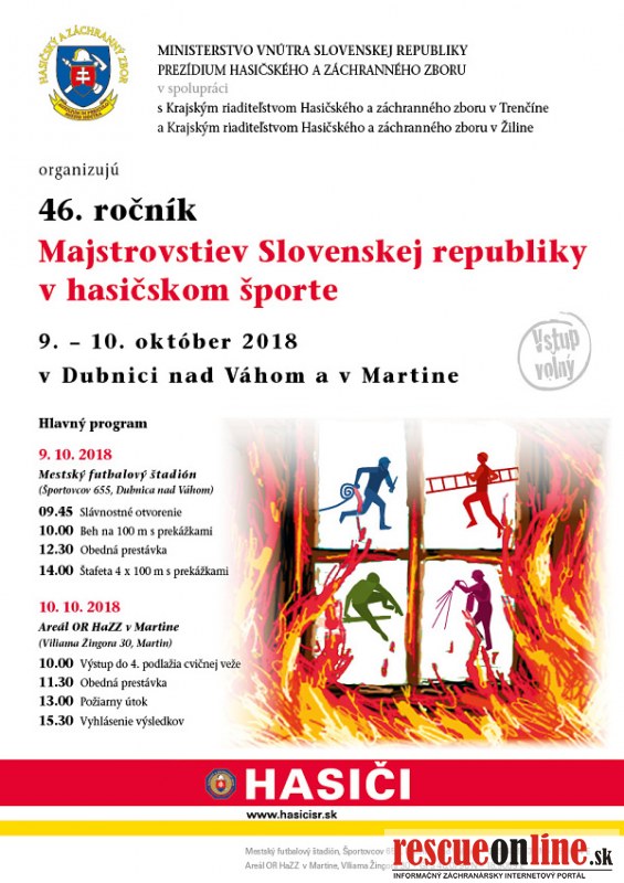 46. ročník Majstrovstiev Slovenskej republiky v hasičskom športe, ktoré sa uskutočnia v dňoch 09. – 10. októbra 2018 v Dubnici nad Váhom a v Martine. Program Majstrovstiev štartuje v utorok 09. októbra o 09.45 hod. na Mestskom futbalovom štadióne v Dubnici nad Váhom slávnostným otvorením súťaže. Po oficiálnom otvorení podujatia bude nasledovať disciplína beh na 100 m s prekážkami. Po obednej prestávke, ktorá sa uskutoční od 12.30 hod. bude program Majstrovstiev pokračovať o 14.00 hod. disciplínou štafeta na 4x100 m s prekážkami.