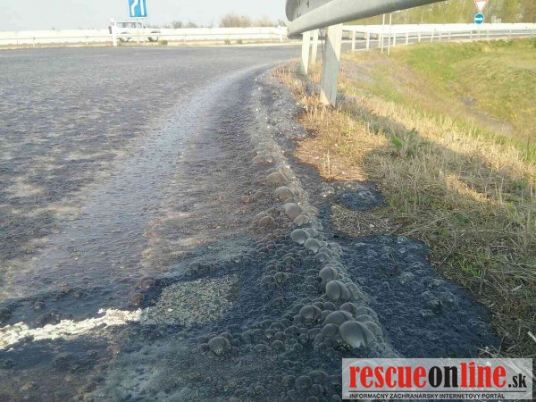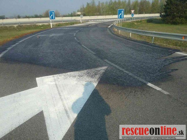 Vodič nákladného auta mal pravdepodobne nedostatočne uchytený náklad, dve 1000 litrové nádrže. Podľa prvotných informácií by malo ísť o 50 % kyselinu dusičnú, ktorá sa vyliala na vozovku. Na mieste zasahuje polícia, hasiči a na miesto idú aj pracovníci životného prostredia a chemici.