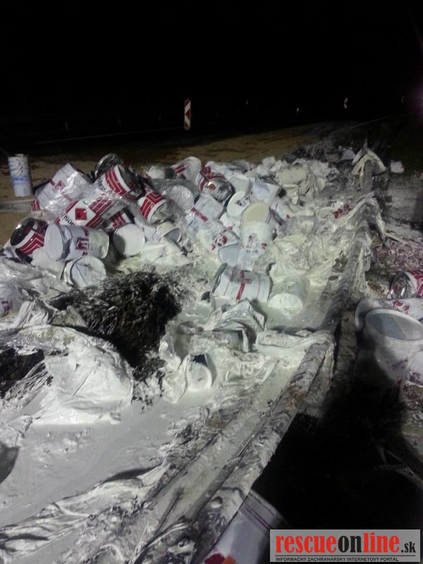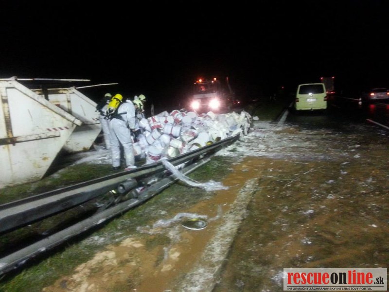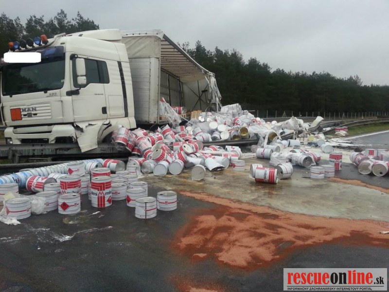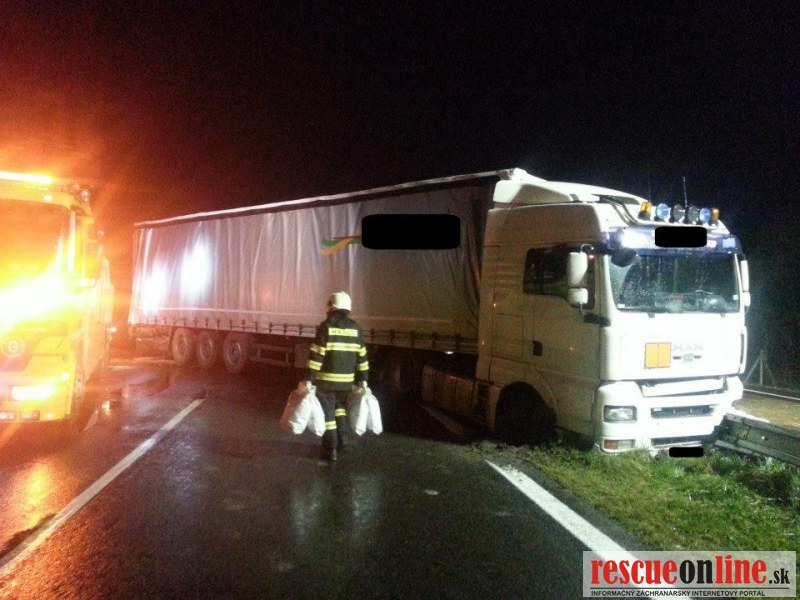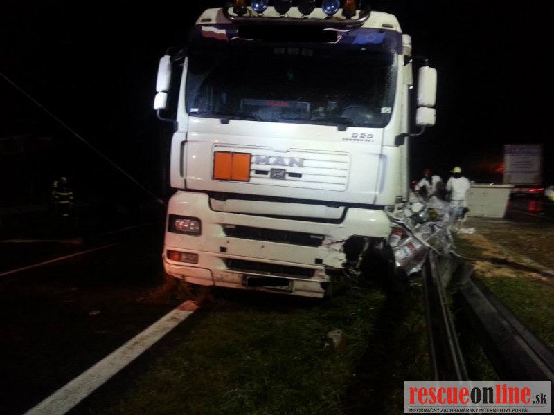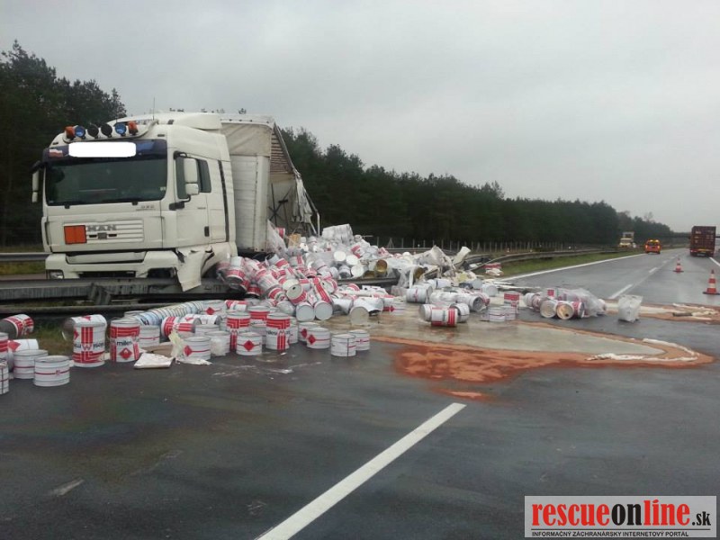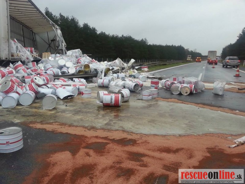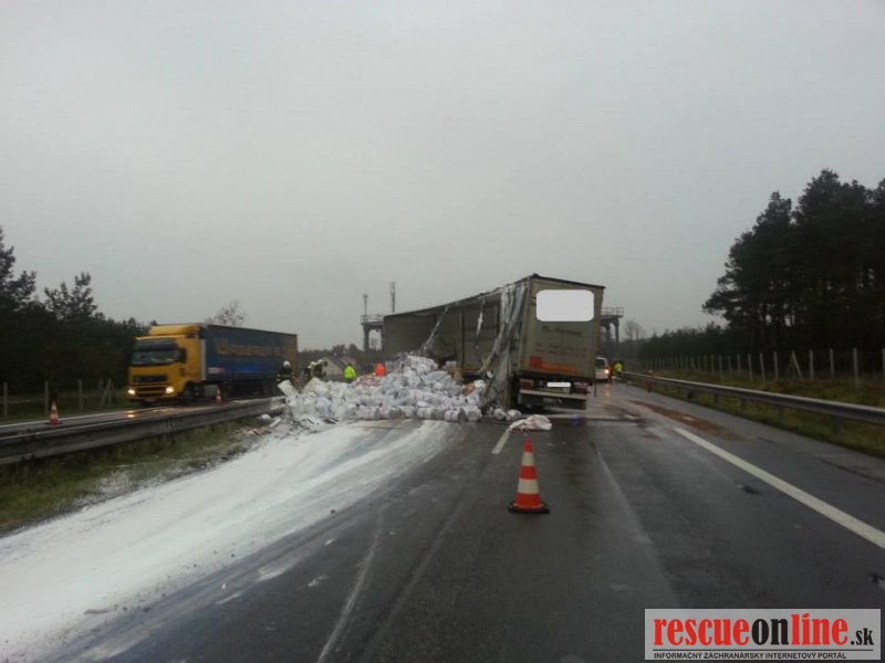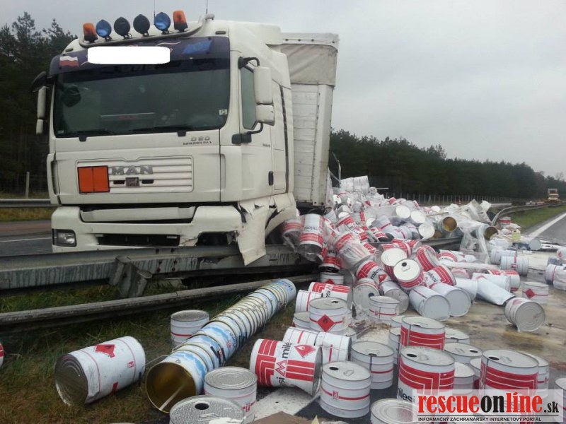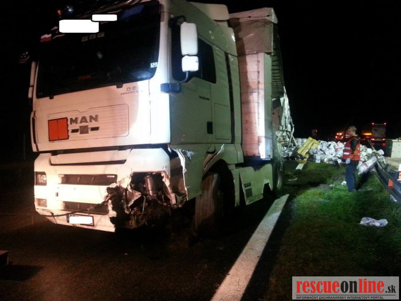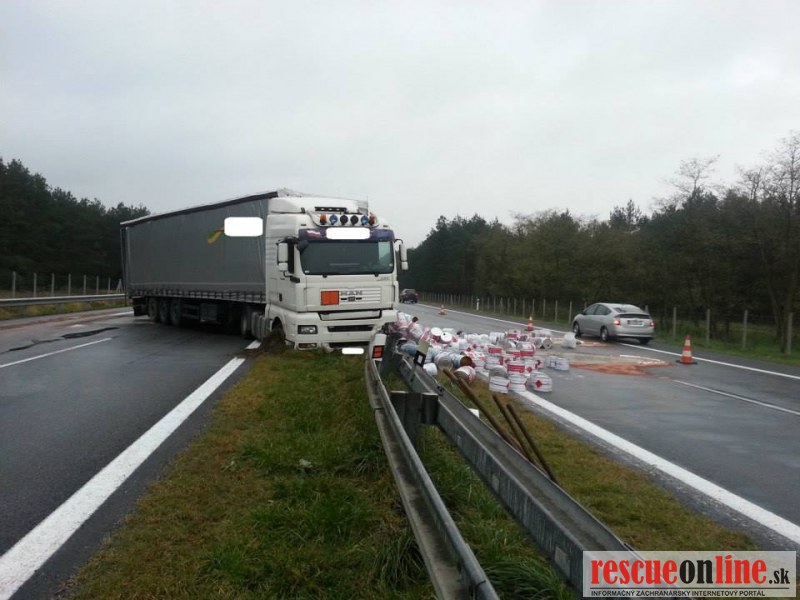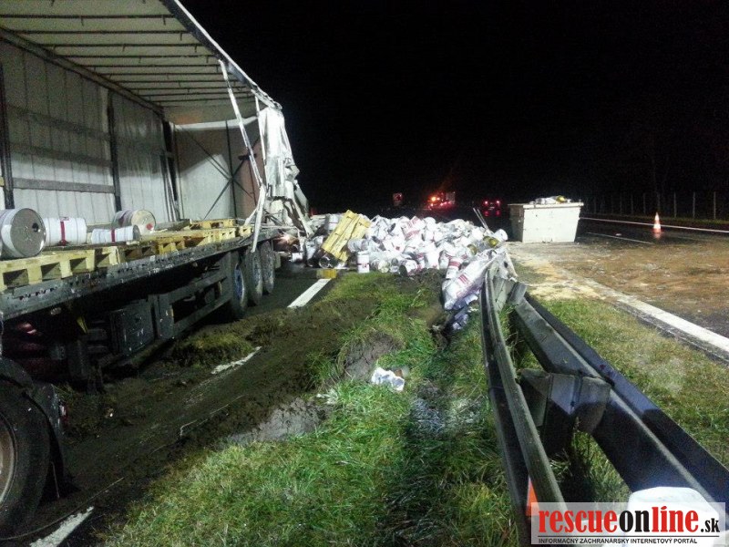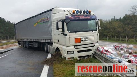 Len pred malou chvíľou sa stala dopravná nehoda na diaľnici D2. Vodič poľského kamióna pravdepodobne nezvládol riadenie, narazil do stredových zvodidiel a následkom nárazu tovar z kamióna vypadol aj do protismeru diaľnice.