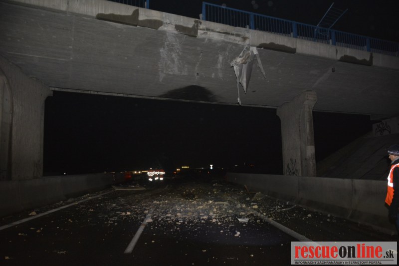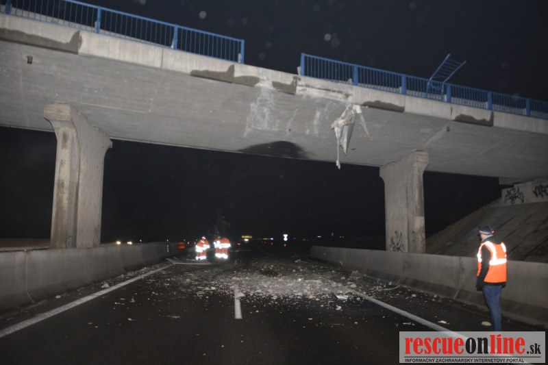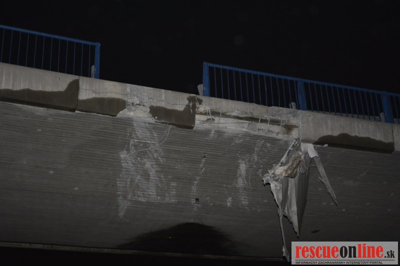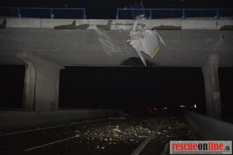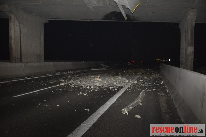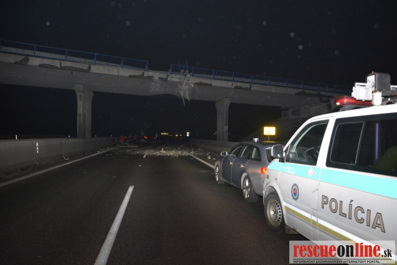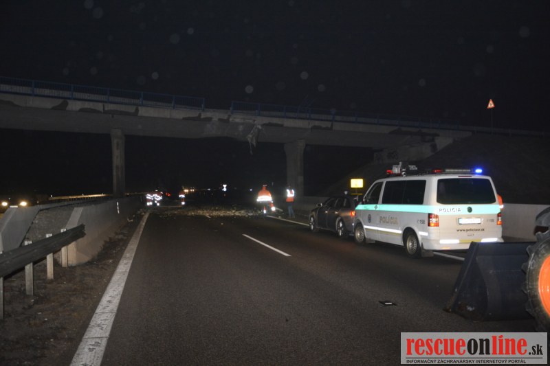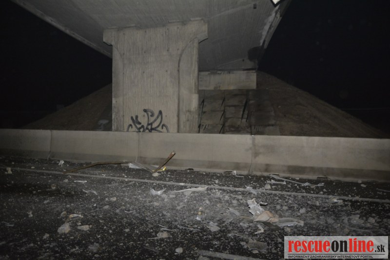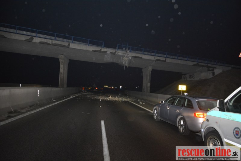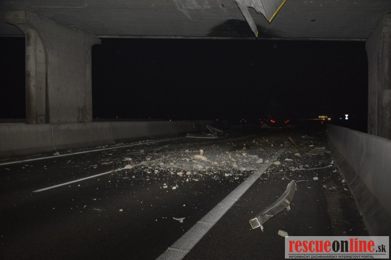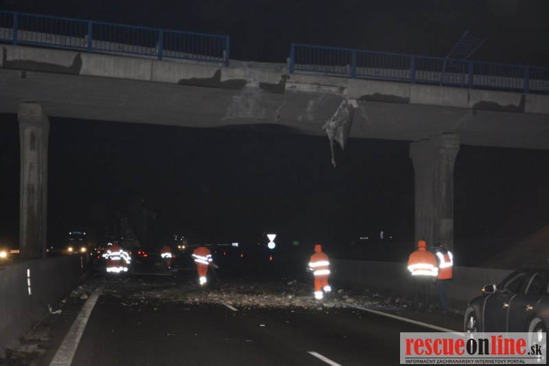 Dopravnú nehodu zavinil vodič kamiónu, ktorý išiel smerom od Trnavy. Pred nadjazdom si nevšimol, že došlo nadvihnutiu zadnej časti súpravy, ktorá vzápätí narazila do mostu. Pri nehode sa nik nezranil, 54 ročný vodič z okr. Nitra sa podrobil orientačnej dychovej skúške na alkohol, ktorá bola negatívna. Škoda na vozidle a poškodenom moste bola odhadnutá na 70000 eur. V zmysle zákona mu policajti za dopravný priestupok uložili na mieste blokovú pokutu. V takýchto prípadoch, ak vodič počas jazdy zistí, že vozidlo, náklad alebo upevnenie nákladu nespĺňajú ustanovené podmienky, je povinný chybu odstrániť na mieste. Ak nevie odstrániť chybu na mieste, pokračovať v jazde môže len primeranou rýchlosťou do miesta, kde chybu odstráni. Pri dojazde nesmie ohroziť bezpečnosť iných a zároveň nemôže prísť k ďalším škodám na ceste.