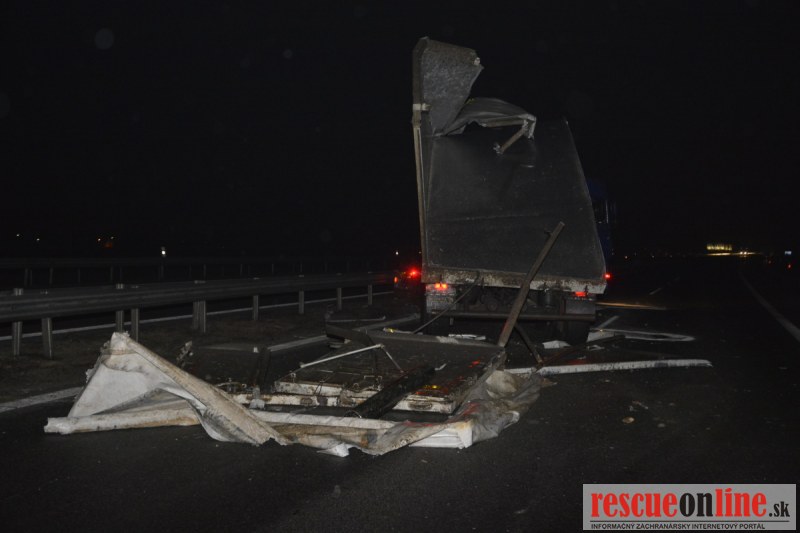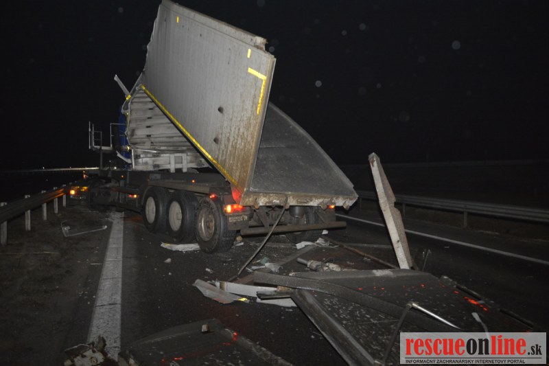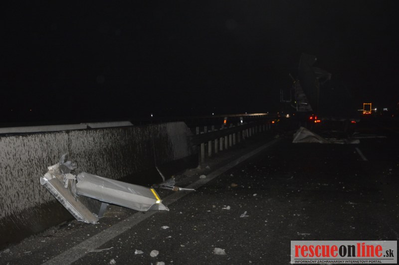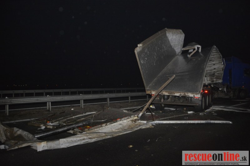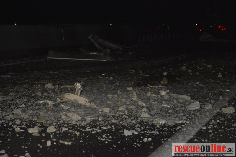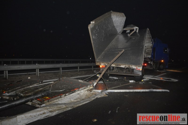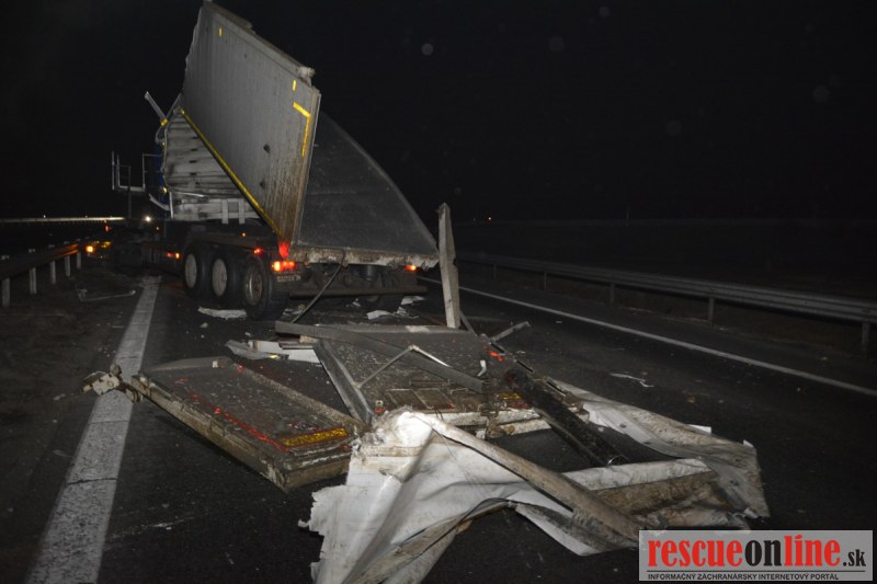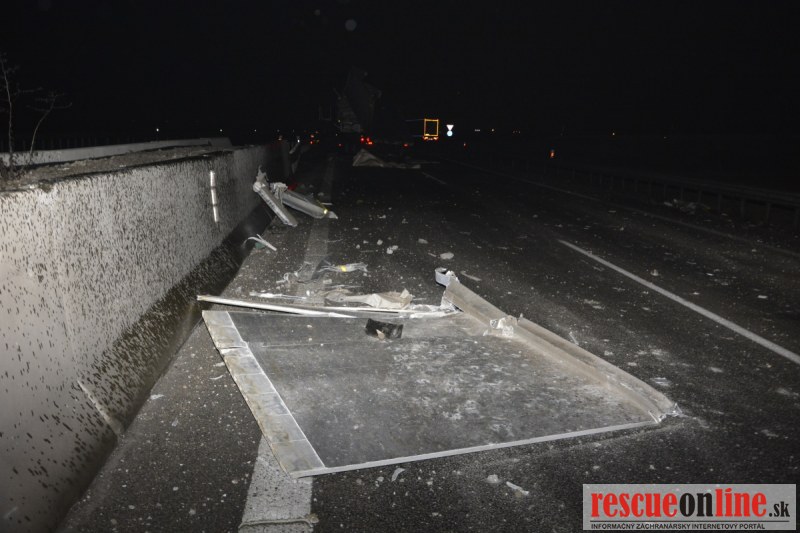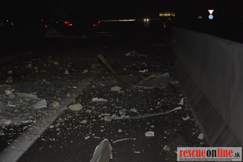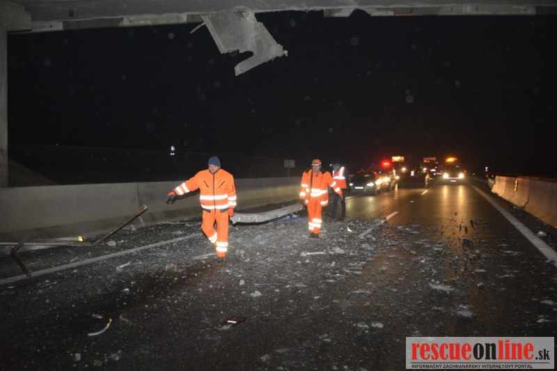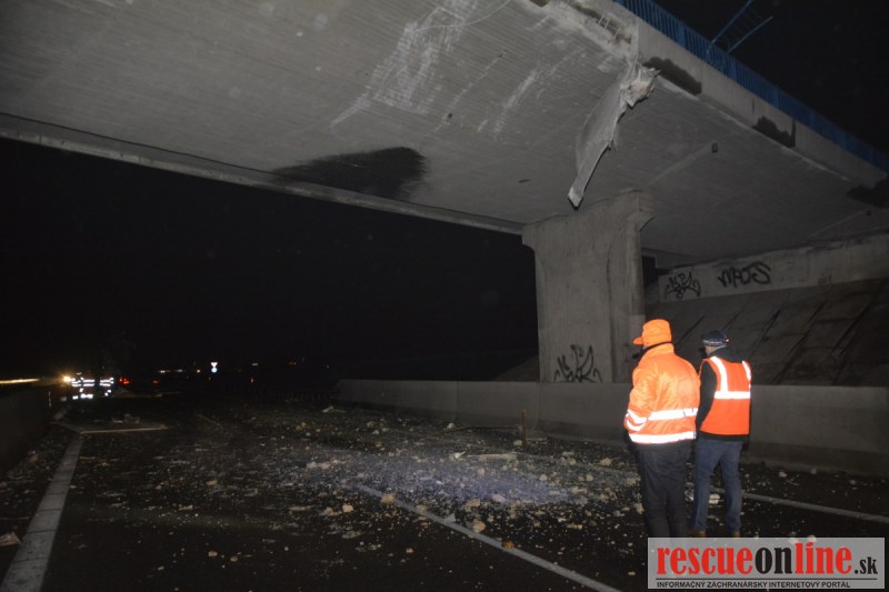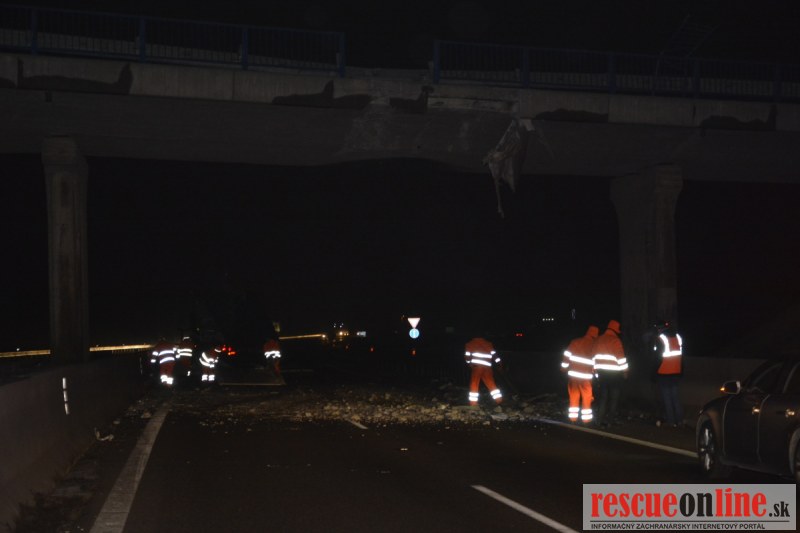 Dopravnú nehodu zavinil vodič kamiónu, ktorý išiel smerom od Trnavy. Pred nadjazdom si nevšimol, že došlo nadvihnutiu zadnej časti súpravy, ktorá vzápätí narazila do mostu. Pri nehode sa nik nezranil, 54 ročný vodič z okr. Nitra sa podrobil orientačnej dychovej skúške na alkohol, ktorá bola negatívna. Škoda na vozidle a poškodenom moste bola odhadnutá na 70000 eur. V zmysle zákona mu policajti za dopravný priestupok uložili na mieste blokovú pokutu. V takýchto prípadoch, ak vodič počas jazdy zistí, že vozidlo, náklad alebo upevnenie nákladu nespĺňajú ustanovené podmienky, je povinný chybu odstrániť na mieste. Ak nevie odstrániť chybu na mieste, pokračovať v jazde môže len primeranou rýchlosťou do miesta, kde chybu odstráni. Pri dojazde nesmie ohroziť bezpečnosť iných a zároveň nemôže prísť k ďalším škodám na ceste.