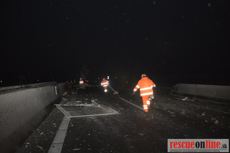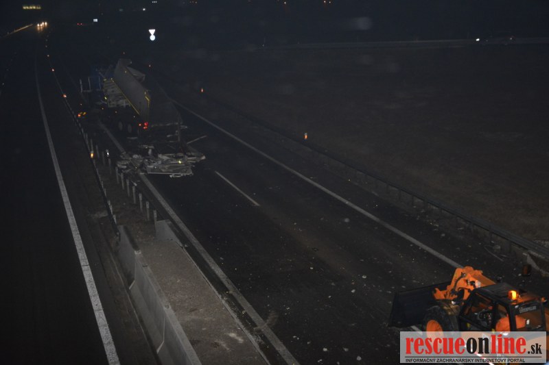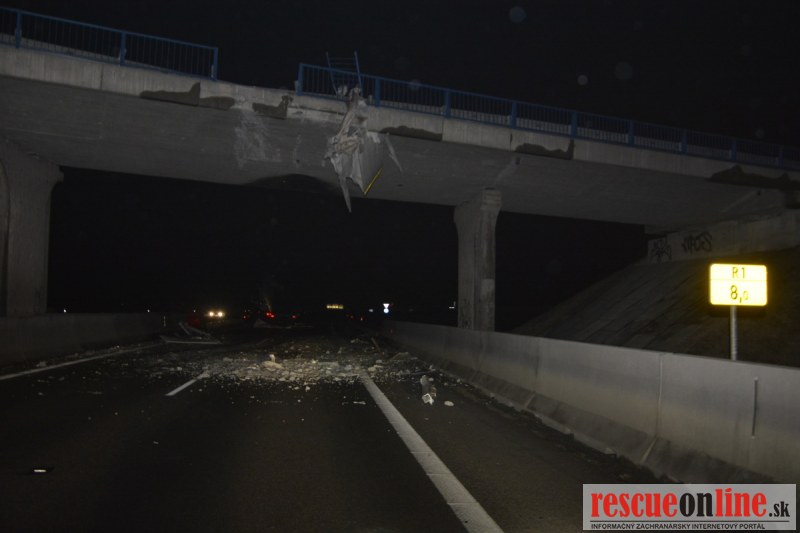 Práve v týchto chvíľach správca komunikácie odstraňuje následky vážnej dopravnej nehody, ku ktorej došlo na rýchlostnej komunikácii R1 v smere Nitra-Trnava pri odbočke na obec Vlčkovce. Kamión tu narazil do nadjazdu čím prišlo k zdeformovaniu návesu a poškodeniu nadjazdu. Na vozovke v smere Sereď-Trnava sú popadané časti zvodidiel ako aj betón z konštrukcie mosta. Premávka pred dopravnou nehodou je políciou a správcom komunikácie presmerovaná na nadjazd a obec Vlčkovce.