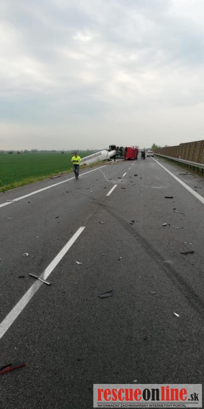 KRPZ Trnava |MM| Polícia aktuálne dokumentuje dopravnú nehodu, ktorá sa stala pri logistickom centre Gáň (okr. Galanta) na ceste II/507 pri kruhovom objazde. K nehode došlo okolo 07.30 h pravdepodobne tak, že vodič VW Passat prešiel do protismeru, kde sa zrazil s kamiónom s cisternou. Ten sa v dôsledku nárazu prevrátil, Passat sa dostal do rotačného šmyku a narazil do druhého kamióna. Pri nehode vodič osobného auta (1995) a jeho spolujazdec utrpeli ťažké zranenia, ďalší spolujazdec v Passate sa zranil ľahko. Úsek cesty I/35 je uzatvorený, polícia vykonáva odklon dopravy cez miestnu časť Nebojsa. Upozorňujeme vodičov, aby zvýšili opatrnosť.