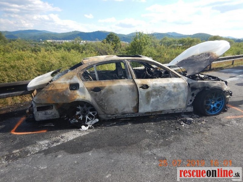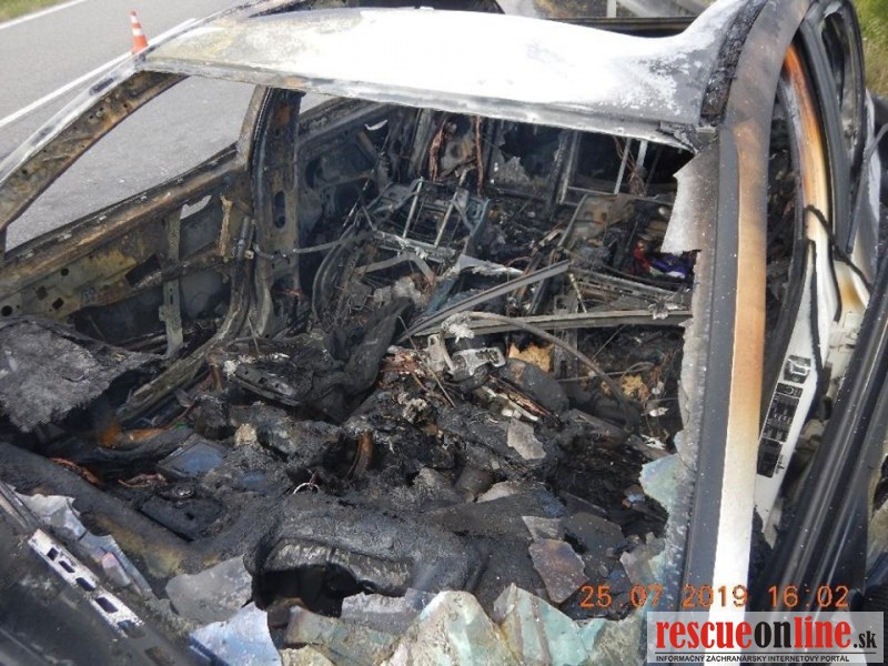Diaľničná polícia objasňuje dopravnú nehodu vozidla, ktoré po nehode úplne zhorelo.