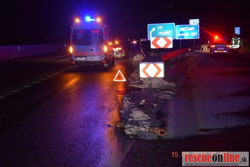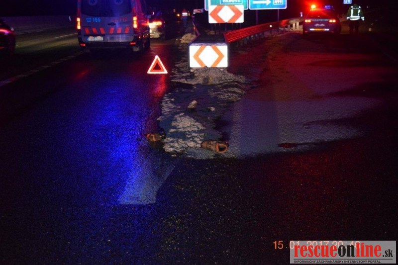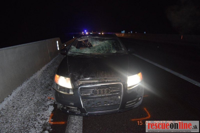 KRPZ Trnava |MM| Polícia vyšetruje okolnosti dopravnej nehody, ktorá sa stala včera (15.1.) o 20.20 h na diaľnici D1 v km 38,15 v katastri Piešťan, smerom na Trenčín. 41 ročný vodič z Česka viedol osobné auto Audi A6, pričom mu z krajnice do cesty náhle vošiel chodec, ktorého nebolo vidieť. Auto chodca zachytilo a odhodilo do pripájacieho pruhu, kde ho zrazil prichádzajúci VW Golf. Jeho 23 ročný vodič taktiež nestihol zrážke s chodcom zabrániť, v dôsledku čoho utrpel 41 ročný muž z Piešťan smrteľné zranenia. Ťažké zranenia utrpela aj spolujazdkyňa v Audi, ktorú zranilo rozbité čelné sklo. Dychovou skúškou polícia požitie alkoholu u oboch vodičov nezistila. Usmrtenému bude požitie alkoholu zisťované pri pitve. Polícia dopravnú nehodu zadokumentovala a poverený príslušník diaľničného oddelenia Krajského dopravného inšpektorátu v Trnave začal trestné stíhanie vo veci usmrtenia a ublíženia na zdraví.