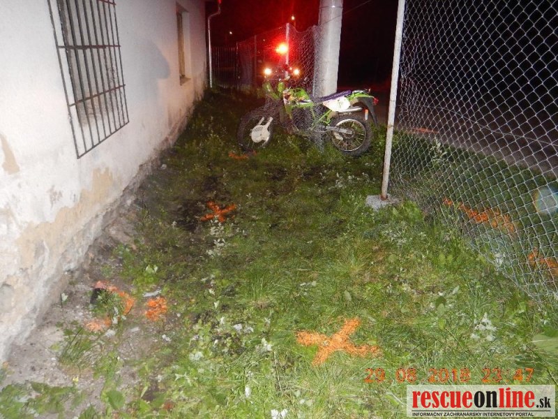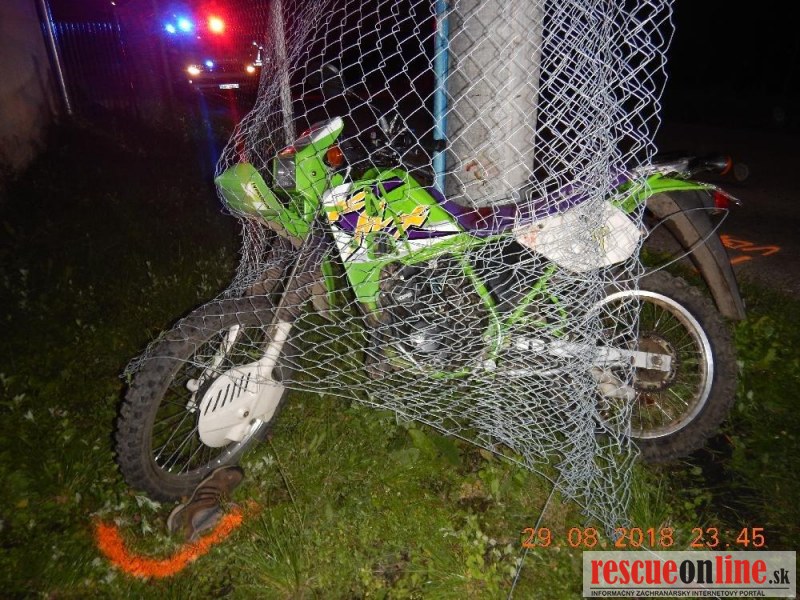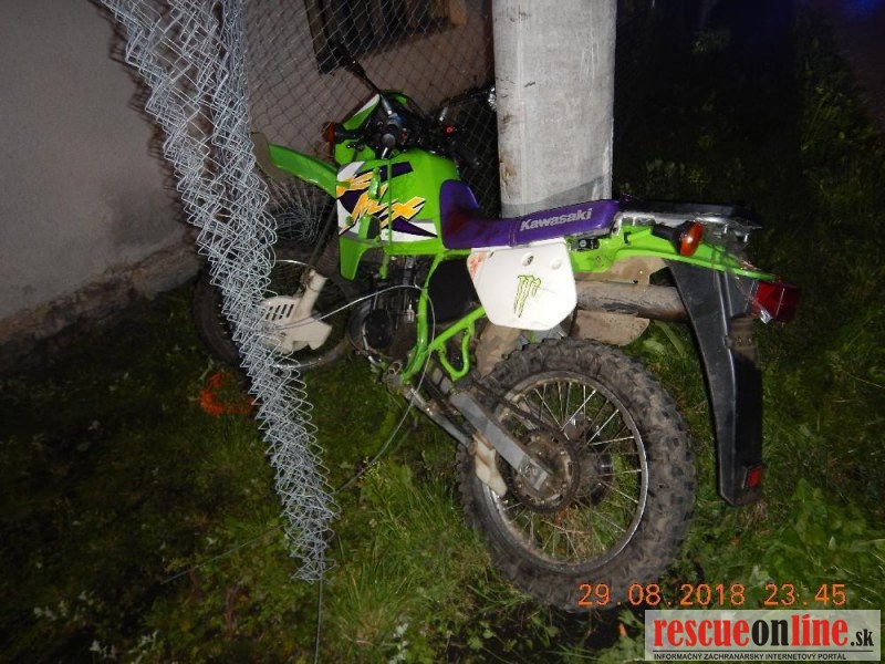KRPZ Banská Bystrica |MM| Polícia v Brezne objasňuje dopravnú nehodu, ktorá sa stala v stredu (29.8.) o 22.45 hodine v Jasení. Motocykel Kawasaki, ktorý bol bez evidenčného čísla, viedol 17-ročný vodič z Predajnej. Jazdil v smere Jasenie – Predajná a pravdepodobne neprispôsobil rýchlosť motocykla svojim schopnostiam a po prejdení pravotočivej zákruty prešiel s motocyklom do protismeru. Zišiel mimo vozovku do trávnatej časti a po prejdení takmer 16 metrov narazil do betónového stĺpa. Na motocykli bol aj 17-ročný spolujazdec z Jasenia, pričom sa obidvaja ťažko zranili. Ani jeden z nich nemal na hlave prilbu, obidvaja utrpeli mnohopočetné zlomeniny tvárových kostí. Vodič nie je držiteľom vodičského oprávnenia, na prípadné zistenie alkoholu bol u neho nariadený odber krvi .