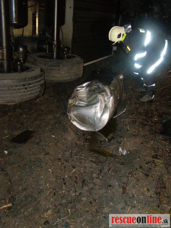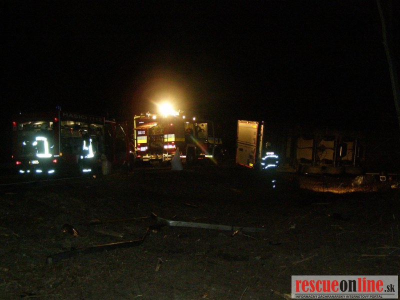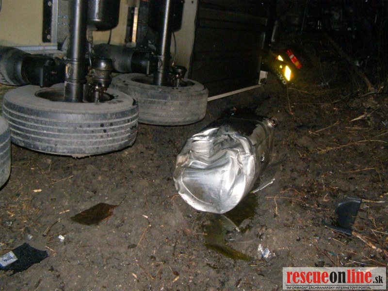 KR HaZZ Trnava |MM| Na ohlasovňu požiarov hasičskej stanice v Hlohovci bola dňa 7.3.2013 o 23:31 hod. prostredníctvom Koordinačného strediska IZS v Trnave nahlásená dopravná nehoda dvoch kamiónov na 75. kilometri diaľnice D1 pri Hlohovci v smere do Piešťan s neuvedeným počtom zranených osôb. Na miesto udalosti boli vyslaní štyria príslušníci z hasičskej stanice v Hlohovci s technikou MB ATEGO. Po príchode hasičskej jednotky na miesto udalosti bolo prieskumom zistené, že sa jedná o dopravnú nehodu slovenského kamiónu značky VOLVO, prevážajúceho mliečne výrobky a nákladného vozidla značky IVECO EUROCARGO s poľským evidenčným číslom, prevážajúceho prepravky, pričom havarovaný kamión sa nachádzal na boku mimo vozovky a nákladné vozidlo na kolesách tiež mimo vozovky, pričom náklad z neho bol porozhadzovaný na komunikácii. V čase príchodu hasičskej jednotky sa účastníci nehody nachádzali mimo vozidiel bez zranení, na mieste udalosti sa nachádzali príslušníci PZ SR. Po krátkom čase sa však vodič kamióna začal sťažovať na bolesti chrbtice, z tohto dôvodu mu bola poskytnutá predlekárska prvá pomoc a po príjazde vozidla Zdravotnej záchrannej služby bola zranená osoba odovzdaná do starostlivosti službukonajúceho lekára. Následne zasahujúci hasiči zistili, že na havarovanom kamióne je odtrhnutá a prerazená nádrž na PHM o objeme 1.000 litrov, z ktorej unikala nafta. Z tohto dôvodu bola na miesto udalosti povolaná hasičská jednotka z Trnavy s ekologickým vozidlom IVECO DAILY a bola vyrozumená aj Slovenská inšpekcia životného prostredia – odbor inšpekcie ochrany vôd. Hasiči z Hlohovca na havarovanom vozidle vykonali protipožiarne opatrenia, pričom počas celého zásahu osvetľovali miesto udalosti osvetľovacím agregátom. Po príchode hasičov z Trnavy bola nádrž na PHM zabezpečená proti ďalšiemu úniku a zvyšná časť nafty v objeme cca. 120 litrov bola následne pomocou špeciálneho čerpadla prečerpaná do pripravených nádob a s vedomím majiteľa spoločnosti, vlastniacej havarovaný kamión prevezená na hasičskú stanicu do Trnavy. Miesta úniku nafty boli posypané sorpčnými látkami a komunikácia očistená. Po zdokumentovaní udalosti a zbalení vecných prostriedkov sa prítomné hasičské jednotky vrátila späť na svoje základne.