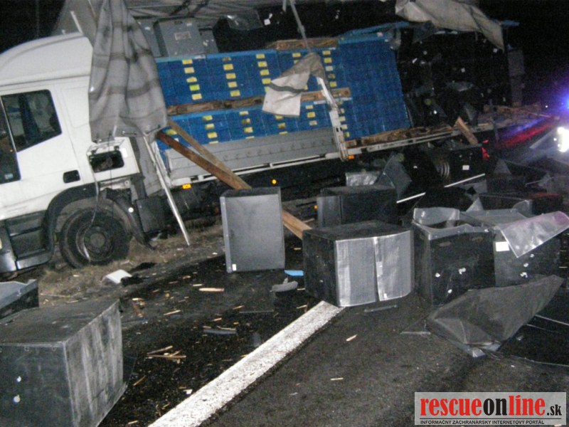 KRPZ Trnava | K dopravnej nehode dvoch kamiónov došlo včera (7.3.) po dvadsiatej tretej hodine na diaľnici D1 pri Červeníku v smere od Hlohovca na Piešťany. Poľský kamión, ktorý viedol 41 ročný vodič, bol pravdepodobne pre poruchu odstavený pri krajnici. Prichádzajúci 42 ročný vodič z Česka so slovenským kamiónom si odstavenú nákladnú súpravu neskoro všimol a pravou prednou časťou narazil do jej ľavej zadnej časti. V dôsledku nárazu boli oba kamióny odhodené do priekopy vpravo a zároveň bol zablokovaný pravý jazdný pruh. Poľský kamión bol odstránený z cesty ráno okolo tretej hodiny. Na odstránení slovenského kamióna sa ešte stále pracuje. Pri nehode utrpel český vodič ľahké zranenia, poľský vodič sa nezranil. Dopravná nehoda sa zaobišla bez alkoholu. Polícia presné príčiny dopravnej nehody a mieru zavinenia vyšetruje.