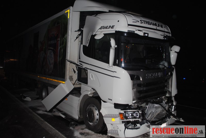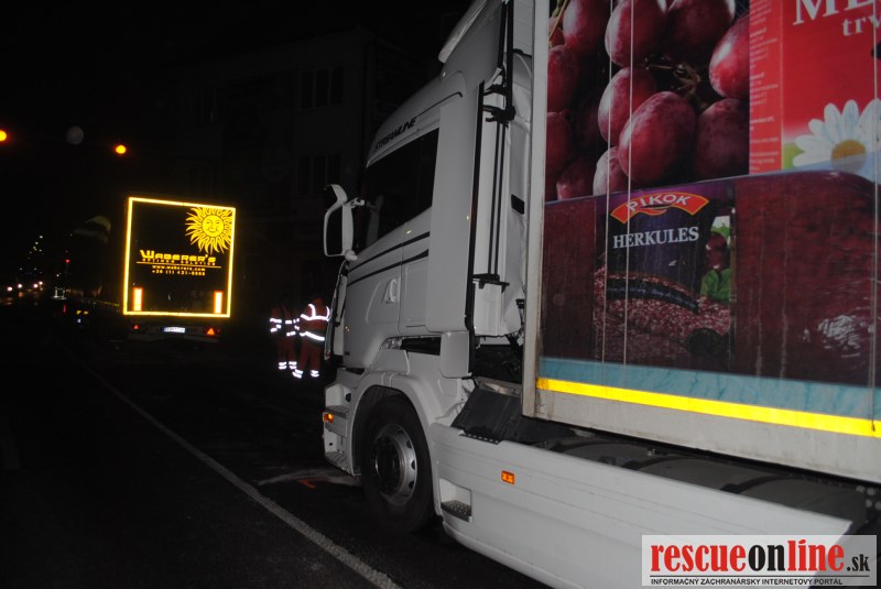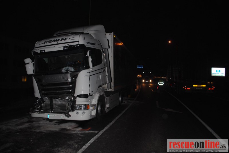 KRPZ Žilina |MM| V piatok 21. februára okolo 4.40 hodine došlo na ceste I/11 v meste Čadca k dopravnej nehode dvoch kamiónov. 45 ročný vodič kamiónu Scania jazdiaci v smere od Žiliny do Čadce pri prechádzaní klesaním z dôvodu nedostatočného venovania sa vedeniu vozidla neskoro spozoroval na svetelnej križovatke stojaci kamión DAF a narazil do jeho zadnej časti. Pri dopravnej nehode utrpel predbežne ľahké zranenia 45 ročný vodič slovenského kamiónu. Ošetrená bola aj osádka rumunského kamiónu, ktorá po náraze utrpela drobné poranenia. Požitie alkoholických nápojov u vodičov polícia nezistila. Hmotná škoda je odhadnutá na cca 53.000,-€. Okolnosti dopravnej nehody vyšetruje polícia v Čadci.