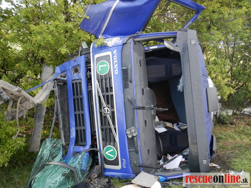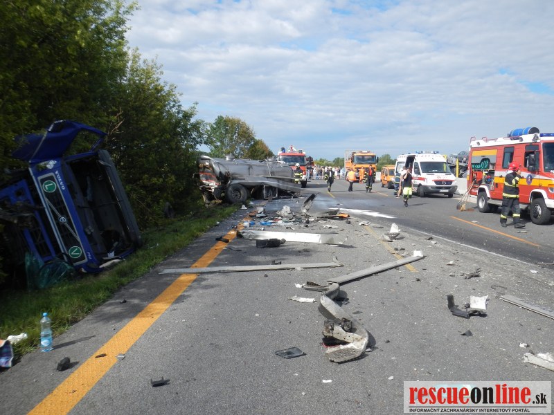 KR HaZZ Trnava |MM| Na ohlasovňu požiarov OR HaZZ v Trnave bola dňa 30.7.2012 o 16.18 hod. nahlásená dopravná nehoda dvoch nákladných motorových vozidiel na diaľnici D1 v smere z Trnavy do Bratislavy. Na miesto udalosti bola vyslaná hasičská technika AHZS MB Atego a MB Vario + 8 príslušníkov. Po príjazde na miesto udalosti bolo zistené, že sa jedná o zrážku dvoch nákladných motorových vozidiel. Prvé NMV sa nachádzalo prevrátené v priekope, ktorého príves čiastočne blokovalo pravý jazdný pruh. Druhé NMV sa nachádzalo v ľavom jazdnom pruhu. Na mieste udalosti zasahovali príslušníci z HS v Senci. Jednotka z OR HaZZ v Trnave sa riadila pokynmi VZ z HS v Senci. Príslušníci zrezali časť stromov, ktoré sa nachádzali v blízkosti prevráteného NMV, spolupracovali pri čistení komunikácie a s prečerpávaním prevážanej kvapaliny(mlieka). Po dohode s VZ sa jednotka z OR HaZZ v Trnave o 21.34 hod. vrátila na základňu bez poškodenia hasičskej techniky a zranenia príslušníkov.