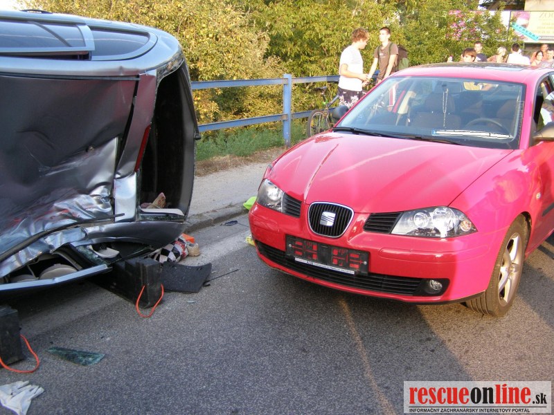 KR HaZZ Trnava |MM| Na ohlasovňu požiarov HS Hlohovec bola v utorok 30. augusta 2011 o 18:03 hod. prostredníctvom IZS v Trnave nahlásená dopravná nehoda dvoch vozidiel a cyklistu v Hlohovci na štátnej ceste č. 513 za mostom smerom k centru mesta. Na miesto udalosti boli ihneď vyslaní štyria príslušníci HaZZ s technikou AHZS MB Atego. Po príjazde na miesto udalosti bolo prieskumom zistené, že na mieste udalosti sa na komunikácii nachádzali dve osobné motorové vozidlá, Škoda Fabia a Seat Cordoba. Na miesto zásahu sa dostavila rýchla zdravotná služba, ktorá sa venovala ošetreniu hlavy zranenej cyklistky. Veliteľ zásahu nariadil zaistiť motorové vozidlo Škoda Fabia proti ďalšiemu pohybu, pretože sa nachádzalo prevrátené na ľavom boku. Vo vozidle sa nachádzala vodička vozidla, ktorá sedela za volantom a bola pri vedomí s menšími odreninami. Za pomoci ručného náradia bolo odstránené predné sklo na vozidle a za pomoci rýchlej zdravotnej služby bola osoba vyslobodená z vozidla a odovzdaná ZZS. Vodička osobného motorového vozidla Seat Cordoba neutrpela zranenia. Pri dopravnej nehode prišlo k odtrhnutiu prívodu a stĺpu verejného osvetlenia. Na vozidlách boli vykonane protipožiarne opatrenia a boli zabezpečené proti úniku prevádzkových kvapalín a PHM. Po ukončení zásahu sa jednotka HaZZ o 18:30 hod. vrátila na základňu.
