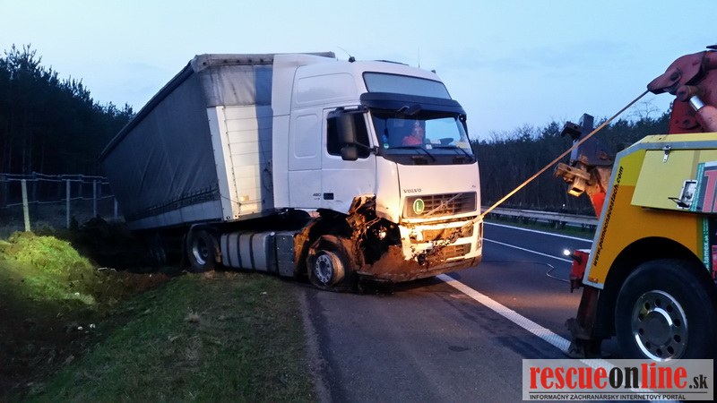 SOSTEAM SLOVAKIA |MM| Dnes 24.3.2016 došlo k dopravnej nehode na D2 pri Lozorne. Na ťahači explodovala pravá predná pneumatika a následne stiahlo celú súpravu do jarku. Bez zranení. Premávka bola obmedzená do jedného jazdného pruhu.