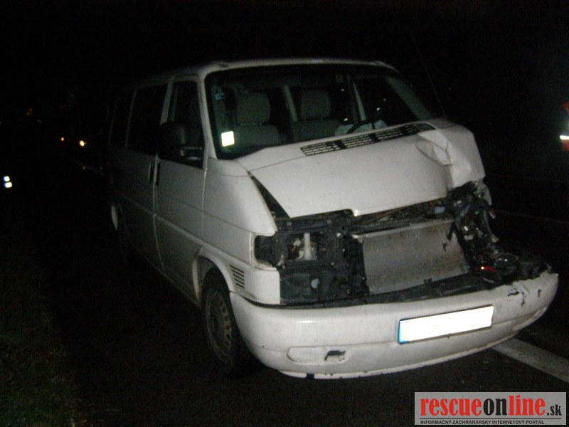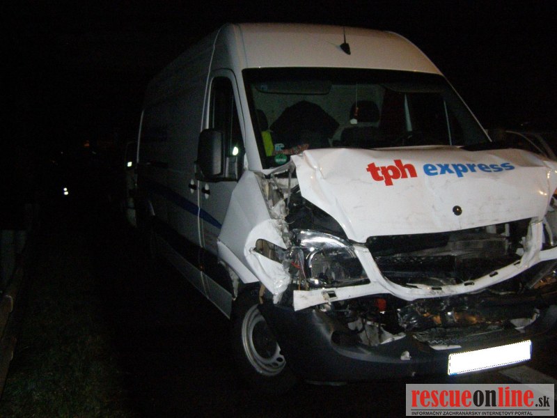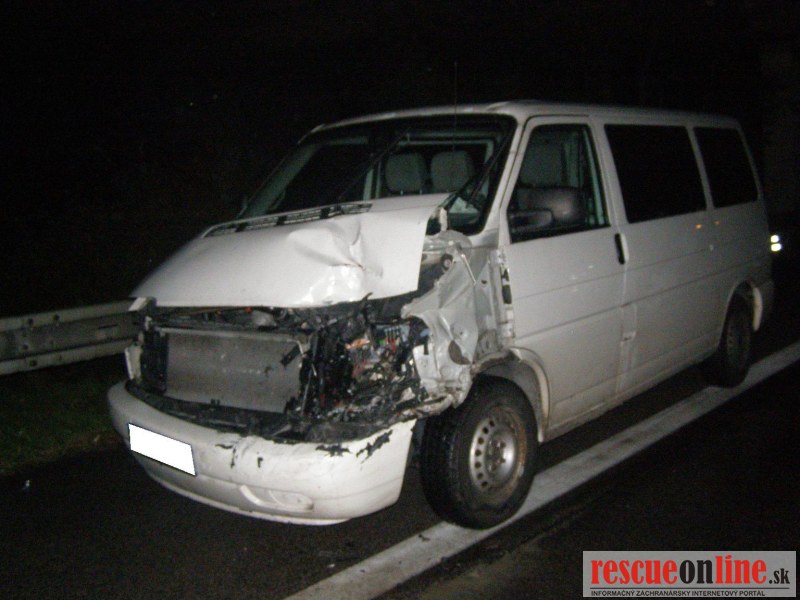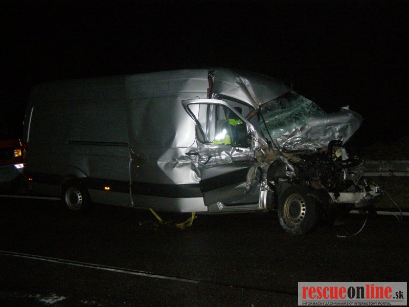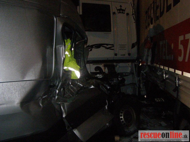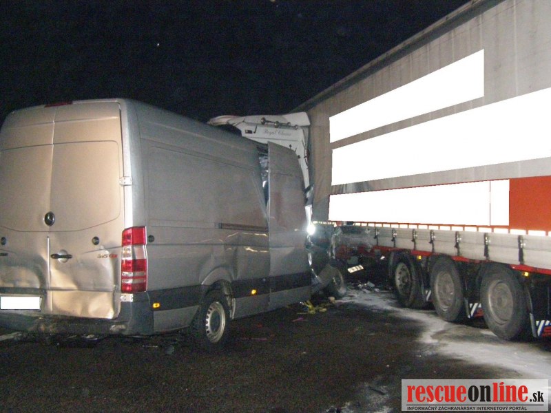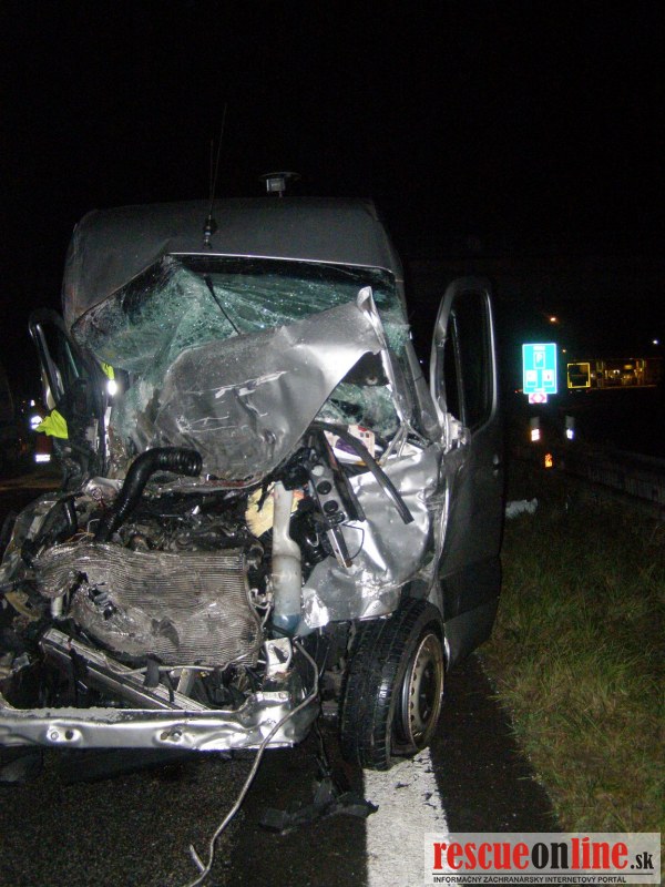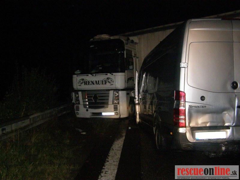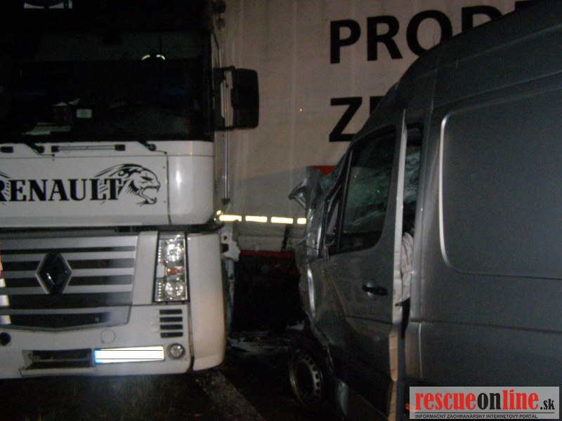 KR HaZZ Trnava |MM| Na hasičskú stanicu Kúty bola v pondelok 24. októbra 2011 o 01:45 hod. nahlásená dopravná nehoda nákladného automobilu na diaľnici D2, km 8 v smere na Bratislavu. Na miesto boli vyslaní štyria príslušníci HaZZ s technikou AHZS Vario. Počas jazdy jednotky z HS Kúty k miestu k udalosti, bolo vyrozumené operačné stredisko KR HaZZ V Bratislave z dôvodu vyžiadania síl a prostriedkov, pričom boli k miestu vyslaní štyria príslušníci HaZZ AHZS Atego z hasičskej stanice Malacky. Po príjazde na miesto bolo zistené, že po dopravnej nehode sa na komunikácii nachádzal nákladný automobil Renault Magnum s návesom skrížený cez celú šírku diaľnice a tri dodávkové vozidla /VW Transporter a dvakrát MB Sprinter/, ktoré do nákladného vozidla narazili. V jednom vozidle MB Sprinter sa nachádzala zakliesnená zranená osoba, ktorú príslušníci HaZZ z vozidla vyslobodili pomocou hydraulického zariadenia. Zraneného ošetrila posádka ZZS. Ďalej si veliteľ zásahu po zhodnotení situácie na mieste vyžiadal vyslobodzovacie vozidlo AV-15 zo Záchrannej brigády Malacky. Po následnej dohode vodiča nákladného vozidla, ktorý uviedol, že si odtiahnutie vozidla zabezpečí sám prostredníctvom súkromnej odťahovej služby, bolo vyslobodzovacie vozidlo AV-15 odvolané. Vzhľadom k tomu, že na komunikáciu vytieklo približne 450 litrov nafty, príslušníci HaZZ vytečené pohonné hmoty neutralizovali sorbentom. Všetky vozidlá boli zabezpečené proti možnému vzniku požiaru odpojením akumulátorov. Diaľnica bola počas zásahu príslušníkov HaZZ uzatvorená v smere na Bratislavu.