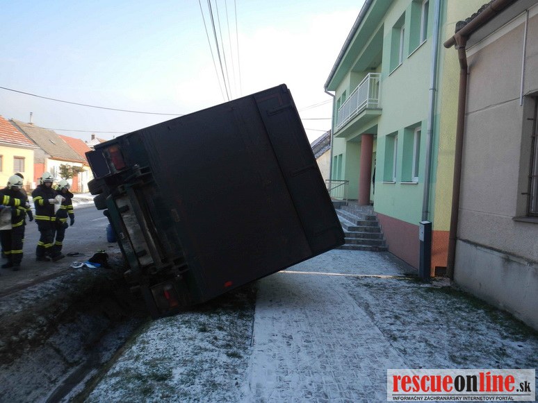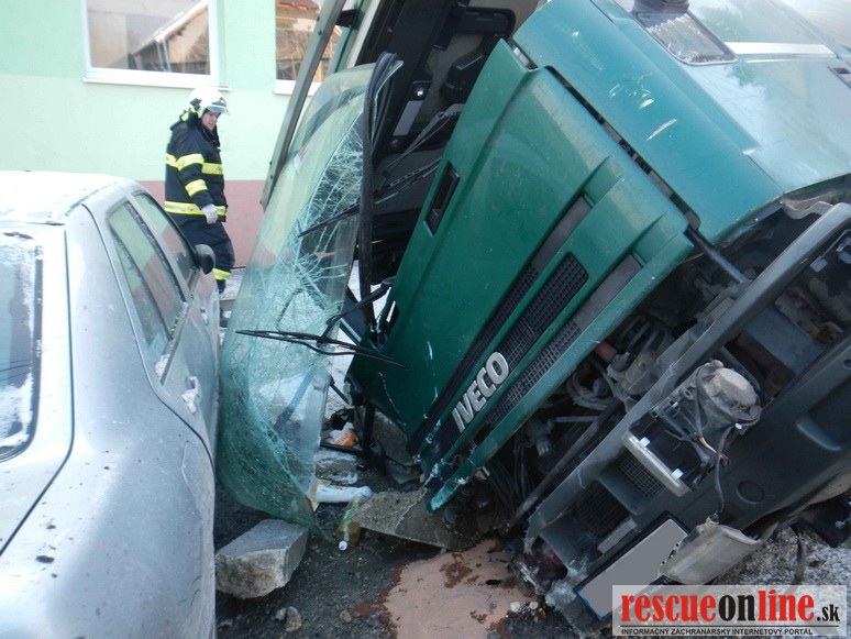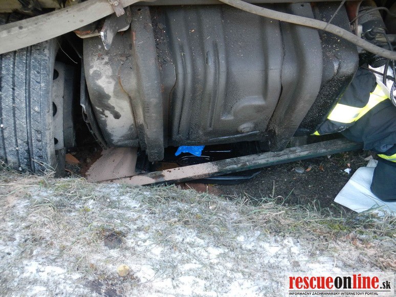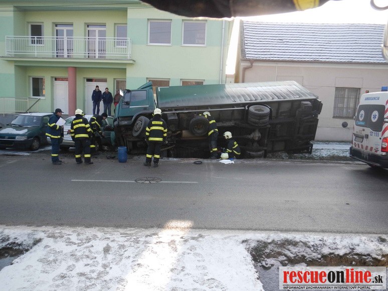 KR HaZZ Trnava |MM| Dňa 28. januára 2014 približne o 09.30 hod. bola ohlásená dopravná nehoda nákladného automobilu v obci Dechtice na ceste č. II/502 (okres Trnava). Nákladný automobil značky Iveco narazil do betónového premostenia a následne do dvoch odstavených osobných motorových vozidiel. V čase dopravnej nehody sa v zaparkovaných osobných motorových vozidlách ani v ich blízkosti nenachádzala žiadna osoba. Nákladný automobil sa po náraze prevrátil do priekopy pri ceste. V dôsledku dopravnej nehody utrpel poranenia vodič nákladného vozidla, ktorý bol v čase príchodu hasičov v opatere zdravotníkov. Z havarovaného vozidla unikali prevádzkové kvapaliny, ktoré hasiči zachytili sorbentom a vykonali na vozidle protipožiarne opatrenia. Následne asistovali pri vyslobodení havarovaného vozidla z priekopy a jeho nakládke na vozidlo odťahovej služby.