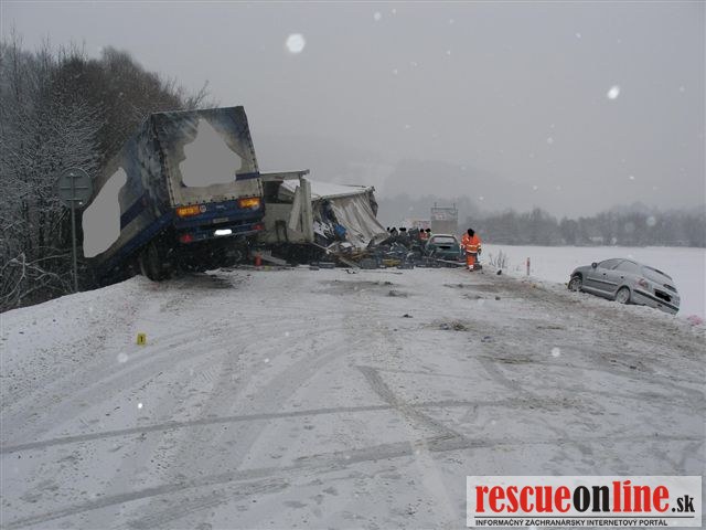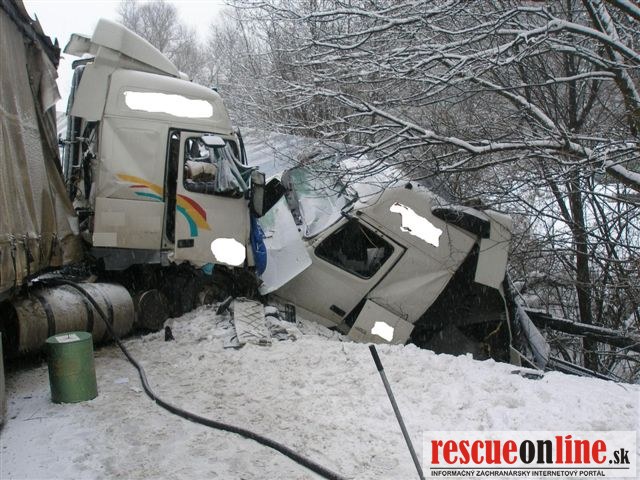 52 ročný vodič (Ostrava, Česká republika ) riadil nákladné motorové vozidlo Volvo s návesom Panav v smere od Čadce na Žilinu. Pri prejazde priameho úseku cesty pred ním, pri pravom okraji cesty, stáli vozidlá z dôvodu havárie iného účastníka cestnej premávky. S jazdnou súpravou začal brzdiť. Bezpečne zastaviť ani spomaliť za stojacimi vozidlami už nedokázal a prešiel do protismerného jazdného pruhu. Následne sa čelne zrazil s nákladným motorovým vozidlom Volvo s návesom Fiegel, ktoré riadil v protismere 53 ročný vodič (okres Tvrdošín). Po náraze bolo vozidlo Volvo, ktoré viedol český vodič odhodené vľavo do priekopy. Z návesu Fiegel došlo k vypadnutiu prepravovaného tovaru, ktorý poškodil osobné motorové vozidlo Ford. Pri dopravnej nehode obaja vodiči nákladných motorových vozidiel utrpeli ľahké zranenia. Alkohol u vodičov zistený nebol. Na motorových vozidlách a prepravovanom tovare vznikla celkovo predbežná škoda vo výške 55.100.-€.