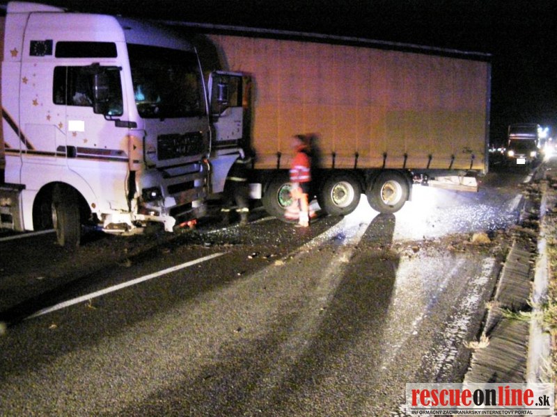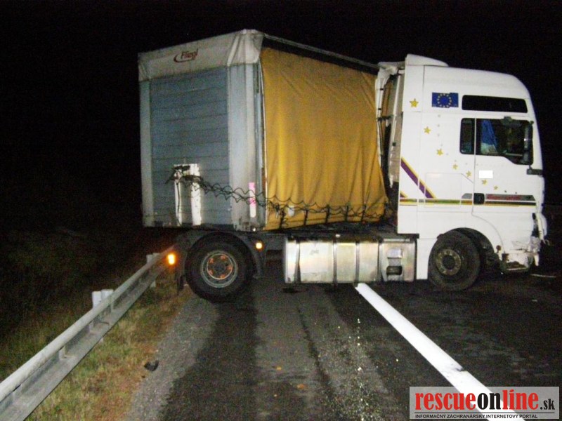 KR HaZZ Trnava |MM| Na ohlasovňu požiarov OR HaZZ v Piešťanoch bola dňa 20. septembra 2012 o 00:48 hod. prostredníctvom Koordinačného strediska IZS v Trnave nahlásená dopravná nehoda nákladného automobilu na 60 km diaľnice D1 v smere Horná Streda – Piešťany. Na miesto udalosti boli vyslaní traja príslušníci z hasičskej stanice v Piešťanoch s technikou MB ATEGO. Počas jazdy na miesto udalosti bolo spresnené, že pri dopravnej nehode utrpela zranenie jedna osoba. Po príchode na miesto udalosti bolo prieskumom zistené, že na mieste sa nachádza poľský kamión – ťahač značky MAN, prevážajúci detské plienky, ktorý je skrížený cez celú šírku jazdných pruhov, z tohto dôvodu bola diaľnica v smere Horná Streda – Piešťany neprejazdná. Na miesto udalosti sa dostavili príslušníci PZ SR, ktorí prejazd uzatvorili. Nakoľko vodič kamiónu bol ľahšie zranený, príslušníci mu poskytli prvú predlekársku pomoc a po príchode vozidla zdravotnej záchrannej služby ho odovzdali jej posádke na ďalšie ošetrenie. Príslušníci HaZZ následne vykonali na havarovanom vozidle protipožiarne opatrenia odpojením rozbitých akumulátorov a neutralizovali vytečené prevádzkové kvapaliny. Na miesto udalosti sa následne dostavila Diaľničná polícia a neskôr vzhľadom k neprejazdnej diaľnici aj zamestnanci Národnej diaľničnej spoločnosti, ktorí havarovaný kamión odtiahli do odstavného pruhu. Miesto udalosti bolo po celú dobu vykonávania zásahu osvetľované osvetľovacím agregátom. Po očistení povrchu vozovky, zbalení vecných prostriedkov a zdokumentovaní udalosti sa hasičská jednotka po sprejazdnení diaľnice vrátila o 03:21 hod. na základňu.