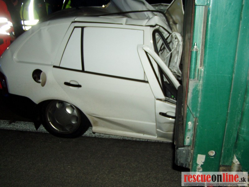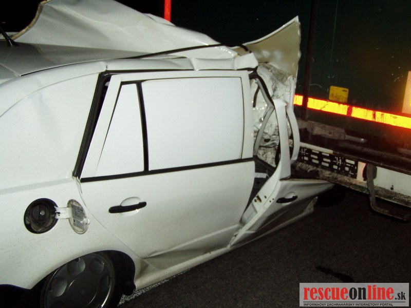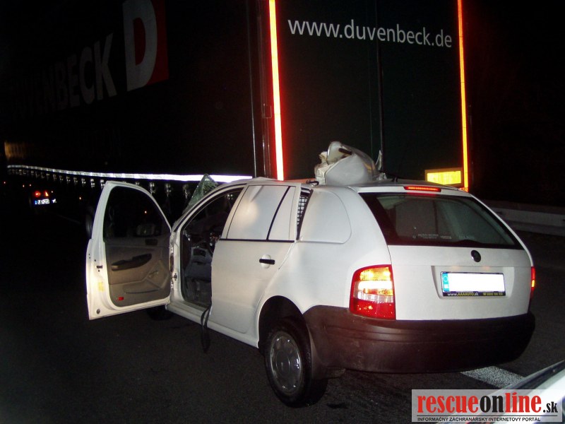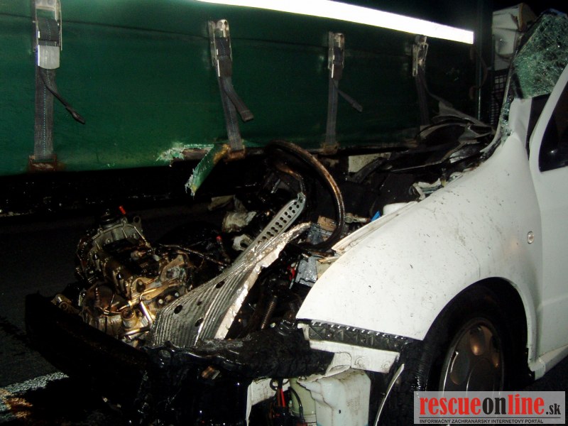 KR HaZZ Trnava | Na operačné stredisko OR HaZZ v Piešťanoch bola v 1. apríla 2010 o 01:21 hod. prostredníctvom IZS Trnava nahlásená dopravná nehoda na diaľnici v smere Horná Streda - Piešťany. Na zásah boli vyslaní štyria príslušníci HaZZ s technikou z hasičskej stanice Piešťany. Po príjazde na miesto udalosti bolo zistené, že do zadnej časti návesu kamiónu MAN TGL narazilo osobné motorové vozidlo Škoda Fabia, vodič ktorého bol zranený. Prostredníctvom IZS bola vyrozumená ZZS a diaľničná Polícia. Príslušníci HaZZ na mieste udalosti poskytli zranenej osobe prvú predlekársku pomoc, vykonali protipožiarne opatrenia a zabezpečili miesto dopravnej nehody svetelnými kužeľmi. Po príchode ZZS asistovali pri naložení zranenej osoby do sanitného vozidla. K udalosti sa dostavila odťahová služba, ktorej príslušníci pomohli osobné vozidlo naložiť a očistili komunikáciu D1 od uniknutých prevádzkových kvapalín. Po zdokumentovaní dopravnej nehody a zbalení vecných prostriedkov sa jednotka o 04:01 hod. vrátila na základňu.