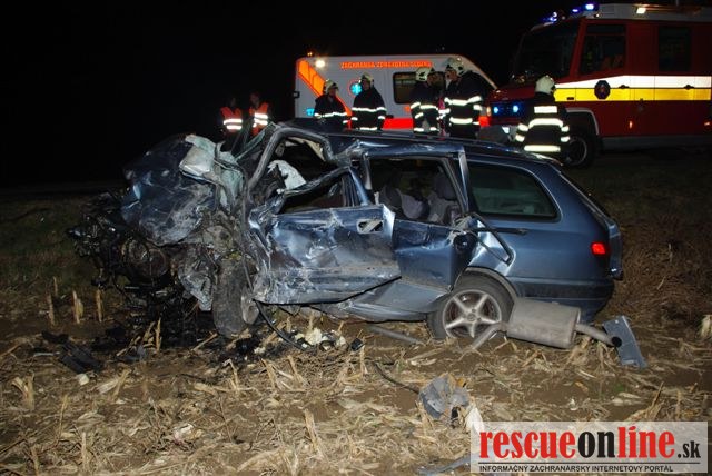 KR HaZZ Trnava |MM| Na ohlasovňu požiarov hasičskej stanice v Seredi bola dňa 29.10.2012 o 20.11 hod. prostredníctvom KS IZS v Trnave ohlásená dopravná nehoda 2 osobných motorových vozidiel (Peugeot, Renault)na štátnej ceste medzi Váhovcami a Kaskádami. Na miesto udalosti bola vyslaná jednotka z HS v Seredi s technikou AHZS MB Vario + 4 príslušníci a jednotka z HS v Galante s technikou AHZS MB Atego + 4 príslušníci. Po príjazde na miesto udalosti bolo prieskumom zistené, že sa jedná o DN 2 osobných motorových vozidiel, ktoré sa nachádzali mimo komunikácie s 2 zakliesnenými osobami. Jednotka HaZZ následne začala s vyslobodzovaním osôb pomocou vyslobodzovacieho zariadenia. Na mieste udalosti vykonávali svoju činnosť pracovníci ZZS a polície SR. U jednej osoby bol lekárom v priebehu vyslobodzovacích prác skonštatovaný exitus. Po ukončení činnosti a zdokumentovaní miesta udalosti sa jednotka HaZZ vrátila bez poškodenia techniky a zranenia príslušníkov o 23.27 hod na základňu.
