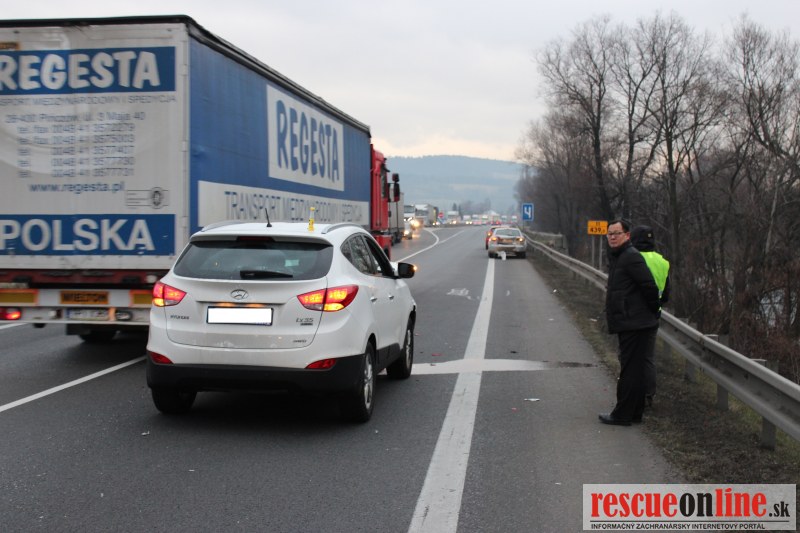 V utorok na ceste medzi Kysuckým Novým Mestom a Žilinou sa stala aj ďaľšia dopravná nehoda, tento krát v okrese Žilina pri obci Brodno. Vodič vozidla Audi sa pravdepodobne otáčal, pretože stál v zápche a chcel to obísť cez inú cestu, keď v tom čase prichádzalo vozidlo Hyundai. Posádka Hyundaiu, už nedokázala zrážke zabrániť. Pri nehode utrpeli zranenia dve osoby, jeden občan Kórejskej republiky, ktorý utrpel zranenie pravej dolnej končatiny a vodič vozidla Audi, ktorý utrpel zranenia krčnej chrbtice. K nehode boli vyslaní hasiči zo Žiliny, hasiči poskytli zraneným prvú predlekársku pomoc, zabezpečili vozidlá proti vzniku požiaru, označili miesto nehody kuželmi a zasypali uniknuté prevadzkové kvapaliny sorbentom. Obaja zranení boli prevezení do FN v Žiline.