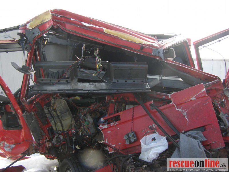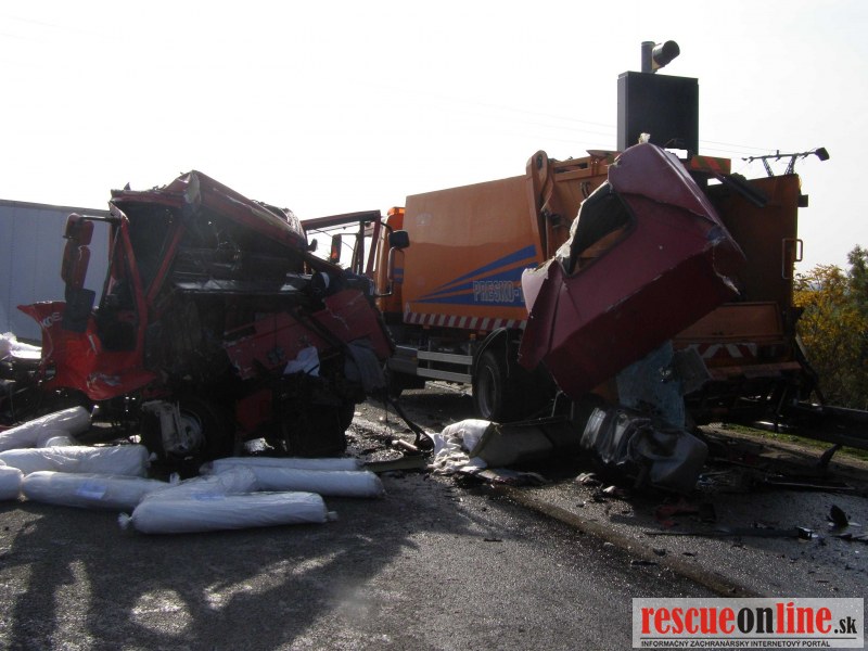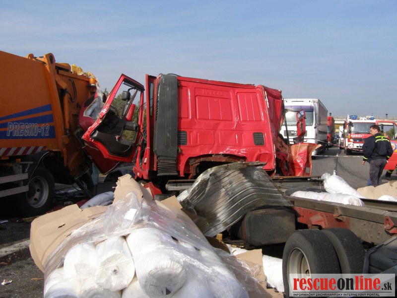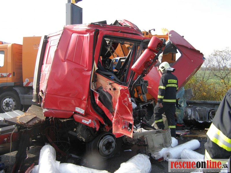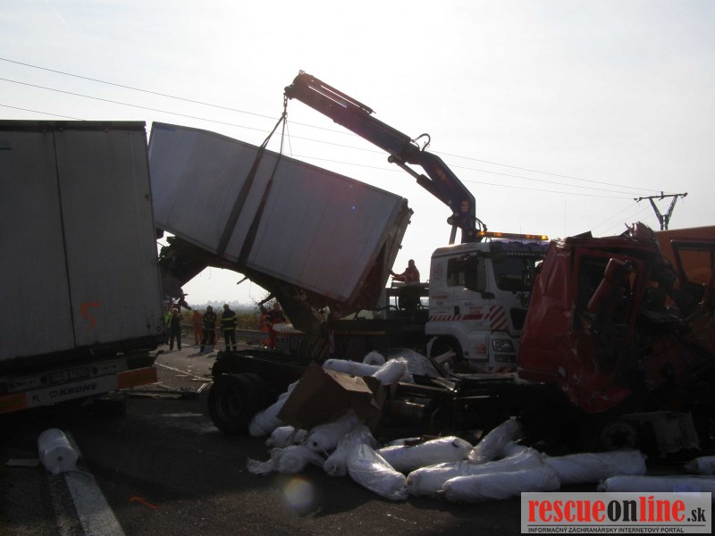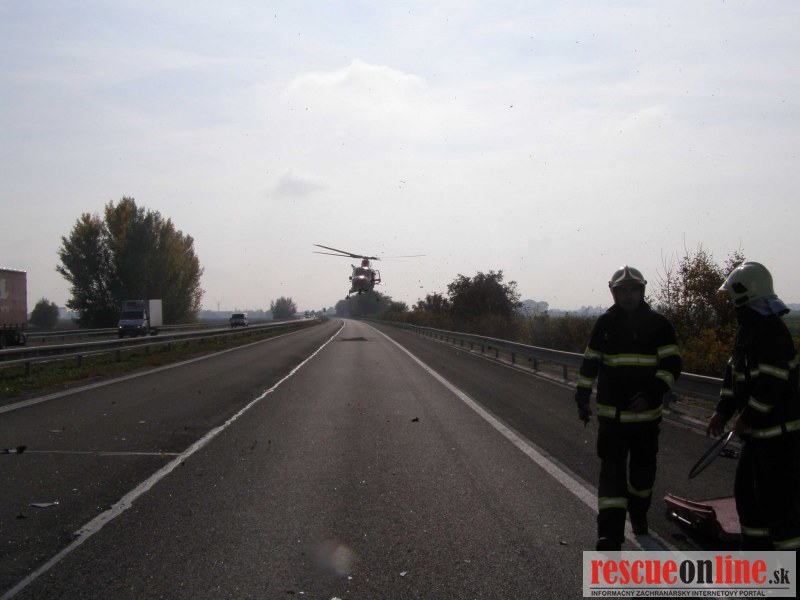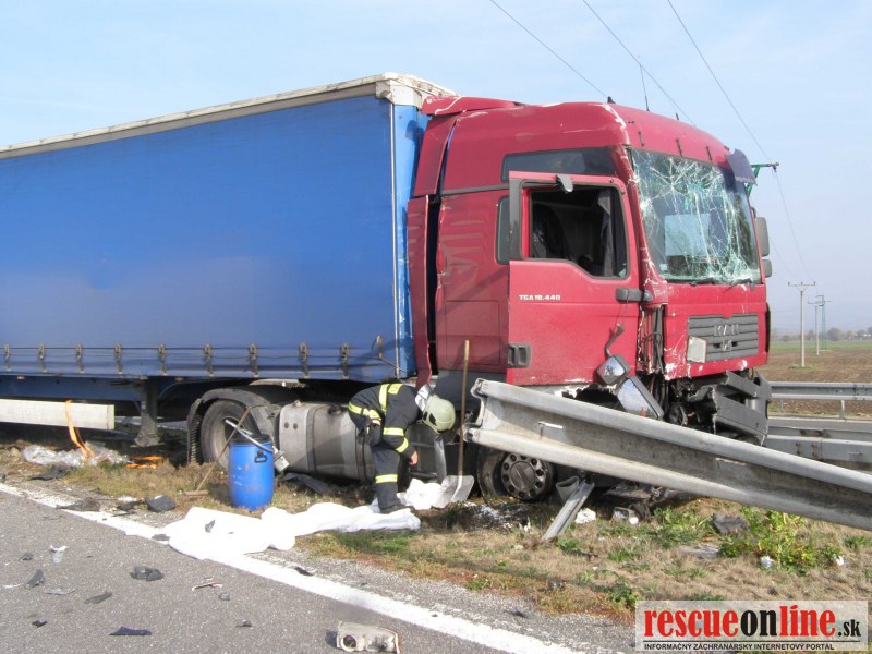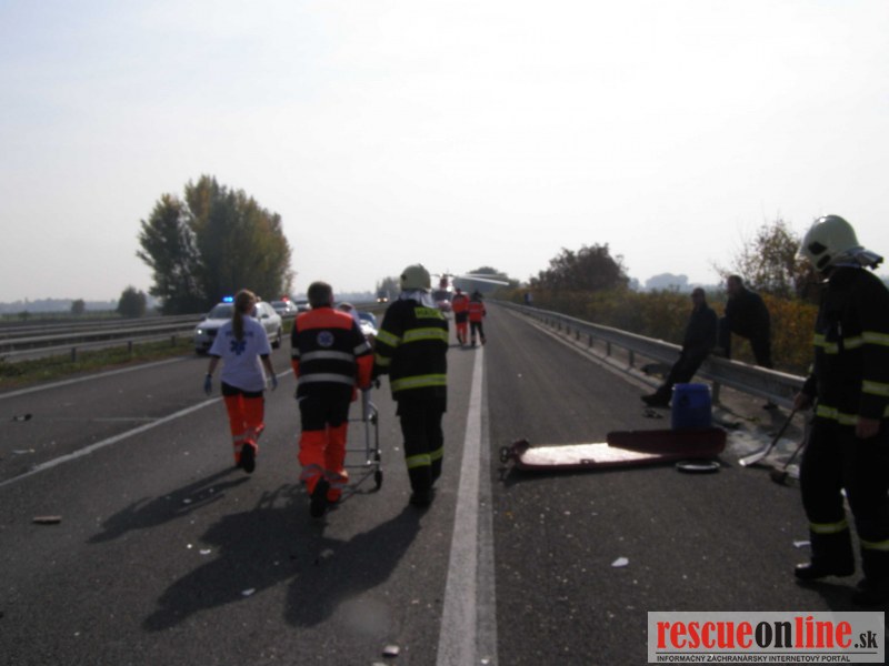 KR HaZZ Trnava |MM| Dňa 14. októbra 2013 o 13.41 hod. bola ohlásená dopravná nehoda troch nákladných vozidiel značky Mercedes-Benz Atego, MAN TGA a Iveco Daily na diaľnici D1 v smere Trenčín – Bratislava pred výjazdom na Piešťany. V dôsledku dopravnej nehody došlo k zraneniu dvoch osôb a k celkovému uzatvoreniu diaľnice, pretože havarované vozidlá blokovali celú šírku vozovky, pričom jedno z havarovaných vozidiel uviazlo v jazdnom pruhu v opačnom smere jazdy. Zasahujúci príslušníci Okresného riaditeľstva Hasičského a záchranného zboru v Piešťanoch (z hasičskej stanice v Piešťanoch) poskytli zraneným osobám predlekársku prvú pomoc a pomohli ich naložiť do vozidiel Zdravotnej záchrannej služby. Jedna zranená osoba bola transportovaná vrtuľníkom Leteckej záchrannej služby. Príslušníci Hasičského a záchranného zboru zabezpečili havarované vozidlá proti vzniku požiaru a unikajúce prevádzkové kvapaliny zneutralizovali pomocou sorpčných látok. Diaľnica D1 bola na 83,5 km v smere Trenčín – Bratislava uzatvorená. Zásah príslušníkov Hasičského a záchranného zboru trval do 17.49 hod.
