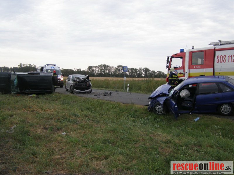 KR HaZZ Trnava |MM| Dňa 31.8.2012 o 16:39 hod. bola na Koordinačné stredisko IZS v Trnave ohlásená dopravná nehoda troch osobných motorových vozidiel na štátnej ceste č. III/063029 v k.ú. Veľké Dvorníky v smere z Dunajskej Stredy na Ohrady s dvomi zranenými osobami. Na miesto udalosti bola vyslaná jednotka z OR HaZZ v Dunajskej Strede s technikou AHZS MB Atego so 4 príslušníkmi. Po príjazde na miesto udalosti bolo prieskumom zistené, že sa jedná o dopravnú nehodu troch osobných motorových vozidiel (Škoda Fabia, Mitsubishi Pajero a Opel Astra) až so šiestymi zranenými osobami, z toho 1 osoba utrpela stredne ťažké zranenia a 5 osôb ľahké zranenia, z tohto počtu bolo jedno dieťa. Príslušníci HaZZ poskytli zraneným osobám predlekársku prvú pomoc, pomohli zranené osoby naložiť do vozidiel ZZS, zabezpečili vozidlá proti vzniku požiaru a úniku prevádzkových kvapalín. Cesta III. triedy je neprejazdná, dopravu riadi polícia. Hasiči stále vykonávajú činnosti na mieste udalosti.