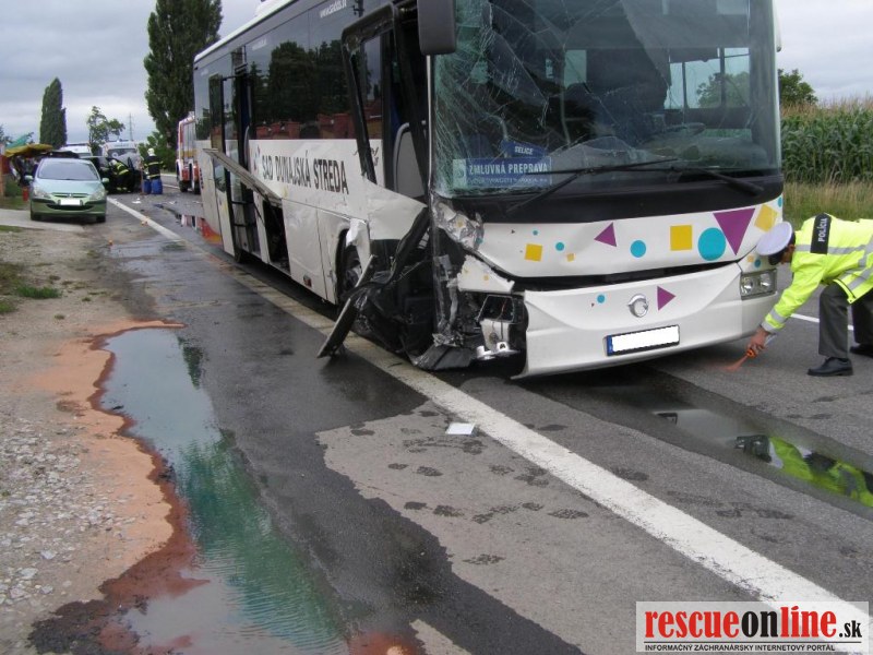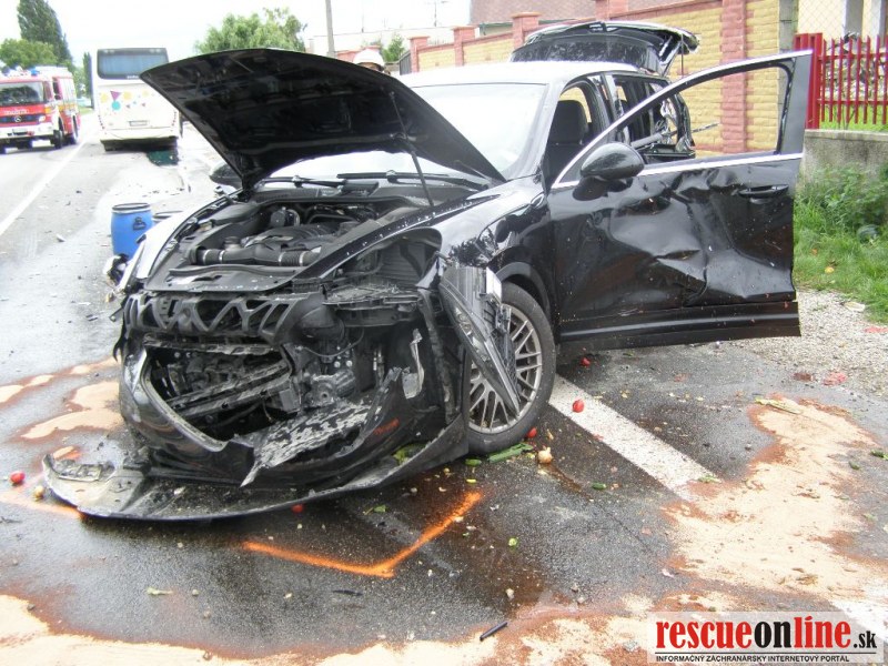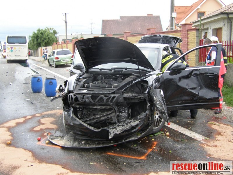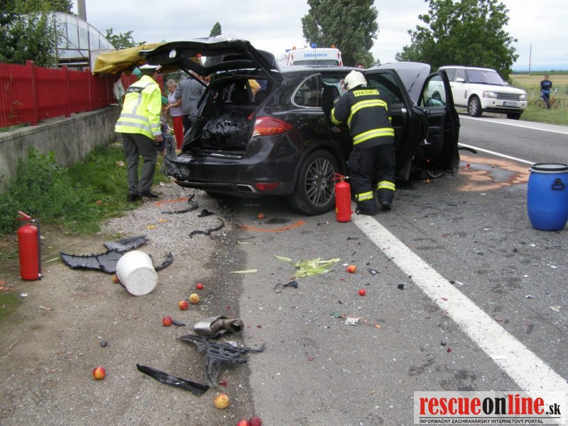 KR HaZZ Trnava |MM| Na operačné stredisko OR HaZZ v Galante bola v nedeľu 31. júla 2011 o 12:19 hod. nahlásená dopravná nehoda osobného motorového vozidla s linkovým autobusom v obci Veľká Mača na št. ceste č.62 zo Serede do Bratislavy s následným nárazom do predajného stánku s ovocím. Na miesto udalosti bola vyslaná jednotka HaZZ z hasičskej stanice v Galante, päť príslušníkov s technikou MB- Atego. Po príjazde na miesto nehody sa na mieste udalosti nachádzali dve sanitné vozidlá, ktorých členovia ošetrovali zranené osoby, dve osoby predávajúce domáce produkty a dve osoby z poškodeného vozidla Porshe Cayenne S. Z vozidiel unikali prevádzkové kvapaliny, ktoré príslušníci ohraničili posypovým sorbentom. Ošetrené osoby pomohli príslušníci naložiť do sanitných vozidiel. Na miesto udalosti sa dostavila polícia Galanta, ktorá riadila dopravu. Veliteľ zásahu si cez operačné stredisko vyžiadal na miesto zásahu dovoz ďalších sorbentov, pretože z vozidiel uniklo cca 200 litrov nafty. Udalosť bola ohlásená správcovi komunikácie a boli vyžiadané ďalšie sorpčné látky od správcu komunikácie. Na poškodenom autobuse bola vykonaná čiastočná oprava a výmena kolesa za pomoci pneumatických vankúšov. Poškodené osobné vozidlo príslušníci HaZZ pomohli naložiť na odťahové vozidlo. Po odtiahnutí autobusu na krajnicu vozovky boli uniknuté látky posypané sorbentom a zneutralizované Bioverzalom. Po spísaní údajov sa jednotka HaZZ o 15:22 hod. vrátila na základňu. Na mieste udalosti zostali pracovnici správcu komunikácie a polícia Galanta.