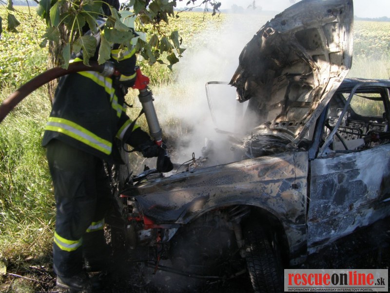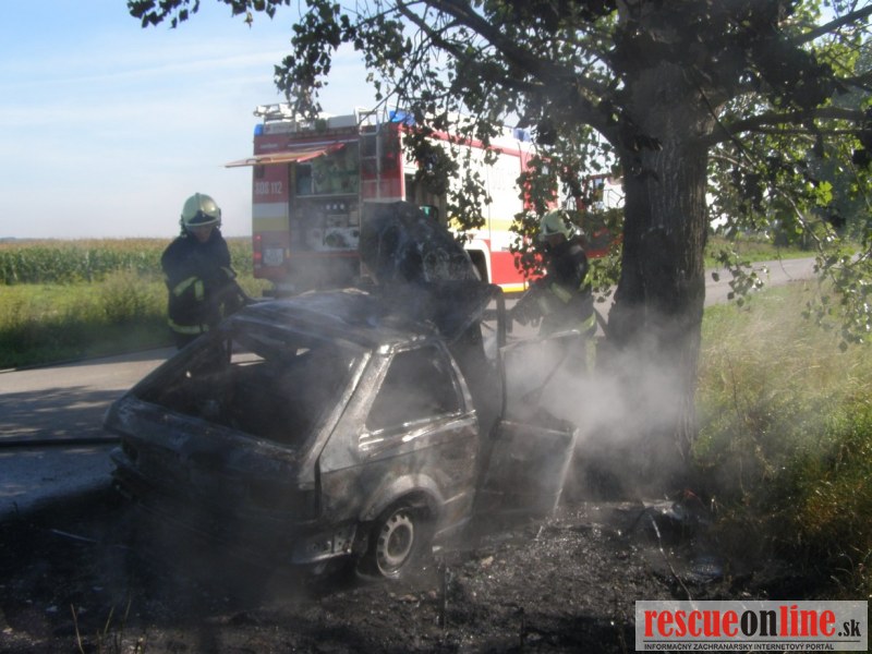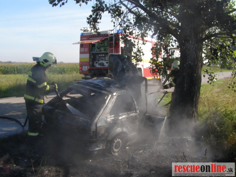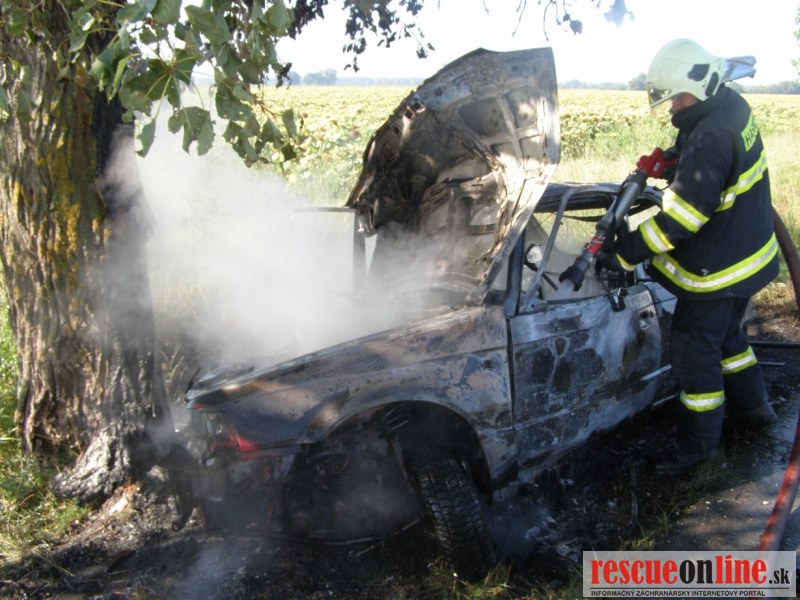 KR HaZZ Trnava |MM| Na operačné stredisko OR HaZZ v Dunajskej Strede bol v stredu 17. augusta 2011 o 08:40 hod. nahlásený požiar osobného auta následkom dopravnej nehody medzi obcami Blahová a Potônske Lúky. Operačný dôstojník vyslal na miesto hláseného prípadu štyroch príslušníkov z HS Dunajská Streda s technikou AHZS MB Atego. Po príjazde na miesto udalosti bolo prieskumom zistené, že osobné motorové vozidlo zn. Mazda 323 bolo čelne narazené do stromu a celé vozidlo horelo. Požiarom bola zasiahnutá suchá tráva a strom. V čase príjazdu hasičskej jednotky sa vo vozidle už nenachádzala žiadna osoba. Príslušníci HaZZ na lokalizáciu a likvidáciu požiaru nasadili vysokotlaký prúd a „C“ prúd - Rambojet na tuhé zmáčadlo. Počas zásahu bolo zistené, že vodička havarovaného vozidla bola ešte pred príchodom hasičskej jednotky odvezená do NsP v Dunajskej Strede okoloidúcou osobou. Následkom havárie k uniku ropných produktov nedošlo. Po likvidácii požiaru havarovaného osobného motorového vozidla, suchej trávy a stromu bolo miesto odovzdané prichádzajúcemu príslušníkovi dopravnej polície sa hasičská jednotka vrátila o 10:36 hod. na svoju základňu.