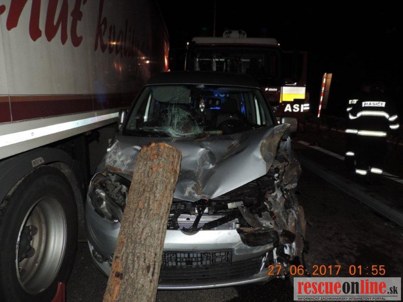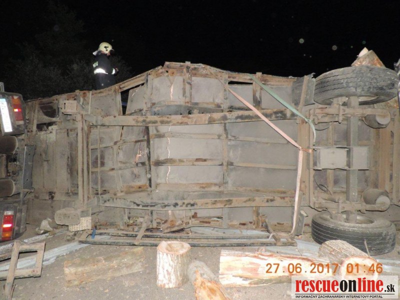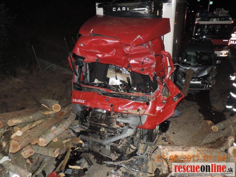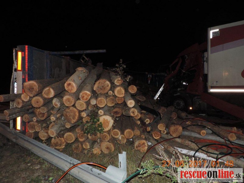 KRPZ Banská Bystrica |MM| K dopravnej nehode došlo v noci 27.6. na rýchlostnej ceste R1, v úseku medzi Novou Baňou a Žarnovicou. 26-ročný vodič kamiónu, ktorý viedol jazdnú súpravu naloženú drevom v smere jazdy od Novej Bane na Žarnovicu, pravdepodobne v dôsledku mikrospánku narazil do stredových zvodidiel, čím sa jazdná súprava stala neovládateľná a došlo k jej prevráteniu do protismernej časti rýchlostnej komunikácie. Vysypané drevo vytvorilo náhlu prekážku kamiónu, ktorý prichádzal v protismere, a ktorého vodič (33-ročný) už nárazu nedokázal zabrániť. Do havarovaných vozidiel ešte následne narazilo osobné motorové vozidlo VW Caddy prichádzajúce tiež v smere od Žarnovice na Novú Baňu. Pri dopravnej nehode došlo k zraneniu vodičov kamiónov. Následky dopravnej nehody spôsobili aj dočasné uzavretie rýchlostnej komunikácie R1 v smere od Žarnovice na Novú Baňu, kde polícia odkláňala dopravu po starej ceste. Dokumentovanie a odstraňovanie následkov dopravnej nehody bolo ukončené dnes v dopoludňajších hodinách, kedy už bola premávka plne prejazdná.