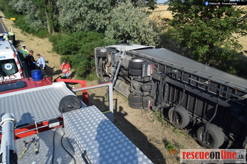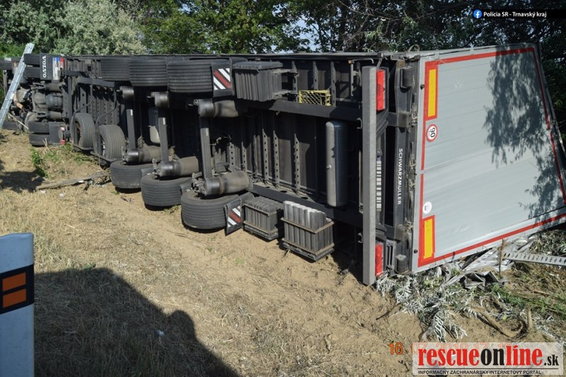 KRPZ Trnava |MM| Diaľničná polícia zasahovala včera poobede pri prevrátenom kamióne na diaľnici D1 v smere na Trnavu. Český vodič nezvládol riadenie a s celou súpravou, plne naložený nákladom, skončil mimo cestu v priekope.