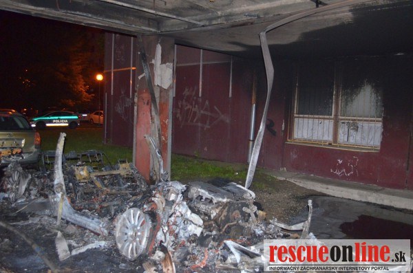 Následkom požiaru boli poškodené aj vedľa stojace vozidlá, Toyota Avensis, BMW a fasáda blízkeho gymnázia.