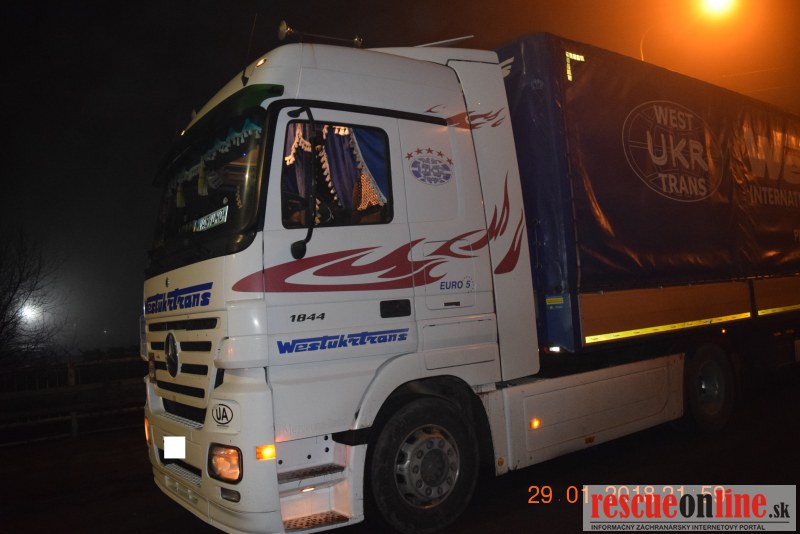 KRPZ Prešov |MM| Na ceste medzi obcami Lada a Lipníky v prešovskom okrese došlo včera (29.1.2018) večer ku kolízií medzi autobusom a kamiónom. Vodič ukrajinského nákladného auta jazdil v smere na Prešov, pričom v spomínanom úseku cesty prešiel ľavou časťou vozidla do protismeru. Spätným zrkadlom na ťahači narazil do oproti idúceho autobusu, na ktorom rozbil tri okná. Vodič nákladného auta nezastavil a pokračoval v jazde ďalej smerom na Prešov. Zastavený bol policajnou hliadkou na Vranovskej ulici v Prešove. Pri náraze utrpela jedna cestujúca v autobuse zranenie, ktoré jej bolo jednorázovo ošetrené v NsP Prešov. Dychové skúšky na alkohol boli u oboch vodičov negatívne. Škoda na autobuse bola predbežne vyčíslená na 7 000.- € a na kamióne na 200.- €. Ukrajinskému vodičovi bola na mieste uložená bloková pokuta 140.- €.
