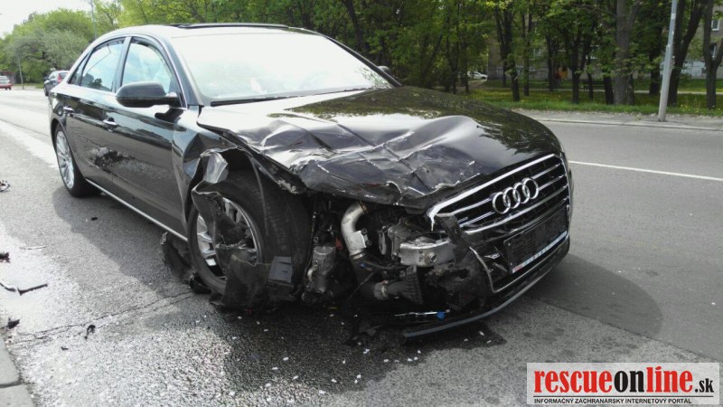 Odťahovka Jaslovský |MM| Len pred pár hodinami došlo v Bratislave na ulici Tomašikova smer Trnavská cesta k dopravnej nehode dvoch osobných vozidiel Audi A8 a Škoda Superb. Vodič Škody Superb odbočoval vľavo a nedal prednosť v jazde Audi A8. Vodič Audi prevezený do nemocnice s menšími zraneniami.