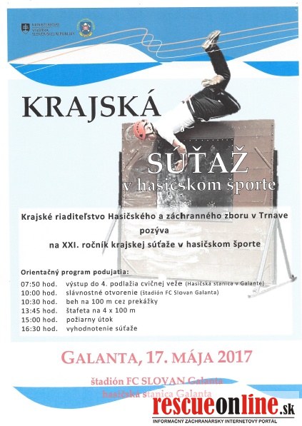 Krajské riaditeľstvo hasičského záchranného zboru v Trnave pozýva na XXI. ročník krajskej súťaže v hasičskom športe, ktorý sa uskutoční dňa 17. mája 2017 v Galante na štadióne FC Slovan Galanta.