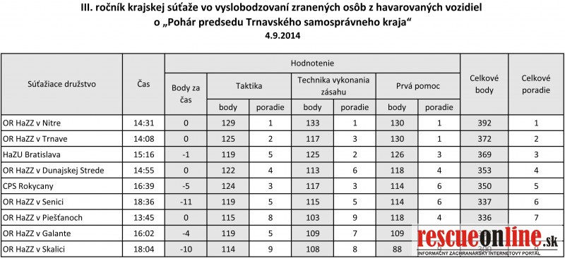 KR HaZZ Trnava |MM| Dňa 04. septembra 2014 sa v Trnave na parkovisku pri Mestskej športovej hale konal už 3. ročník Krajskej súťaže vo vyslobodzovaní zranených osôb z havarovaných vozidiel. Podujatie organizuje Krajské riaditeľstvo Hasičského a záchranného zboru v Trnave pod záštitou predsedu Trnavského samosprávneho kraja. O pohár predsedu Trnavského samosprávneho kraja bojovalo 9 družstiev. Po prvýkrát mala súťaž medzinárodnú účasť.