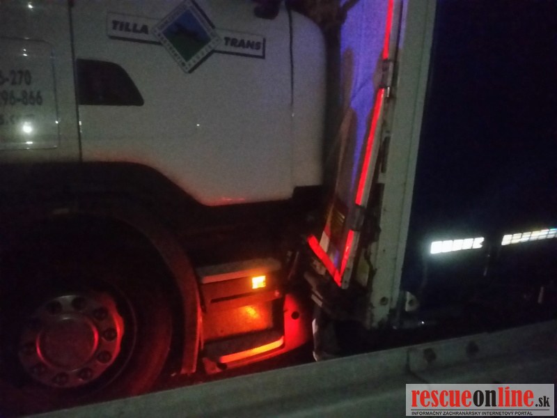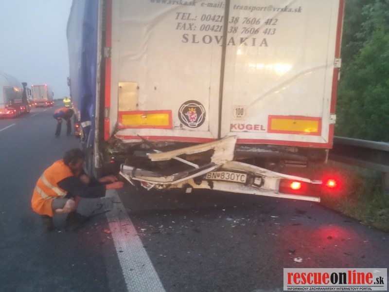 SOSTEAM SLOVAKIA |MM| V skorých ranných hodinách došlo dnes k dopravnej nehode dvoch jazdných súprav na diaľnici D2 na 8.km od Českej republiky v smere do Malaciek. Slovenský vodič stál v odstavnom pruhu z dôvodu defektu na návese. Maďarský kamionista pod vplyvom alkoholu narazil do zadnej časti slovenského kamióna. Nehoda bez zranení.